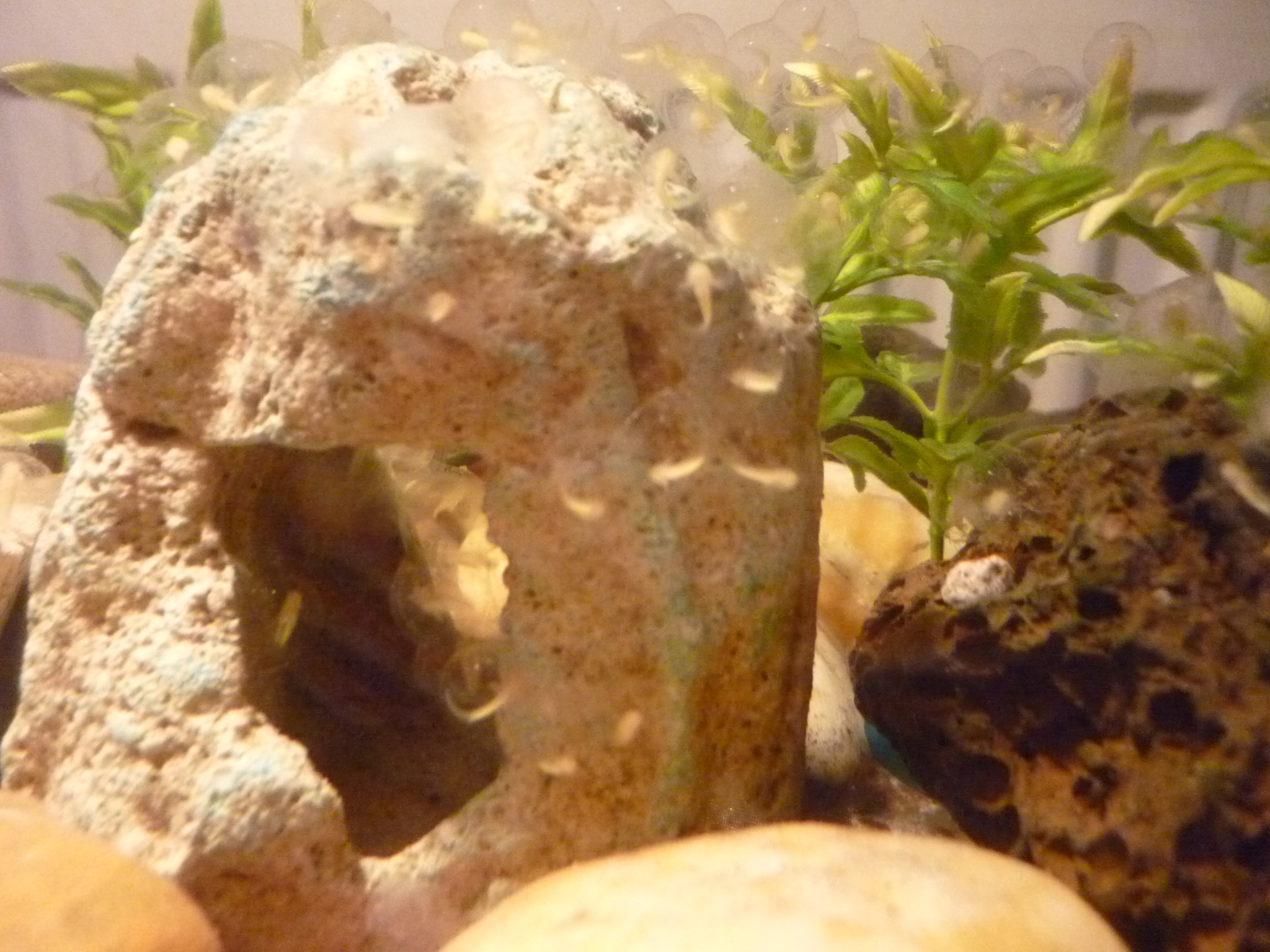 Vasárnap kikelt az összes bébi,,,-hétfőre egy picit megfogyatkoztak sajnos...-nagyon nagy örvényt kavart a hydor levegőztető,nem is értettem,és sajna ma reggelre sok nem élte túl...le kellett cserélnem az egész vizet,meg a berendezést is,hogy lássam minden rendbe lesz a megmaradt picikkel-most harisnyás megoldással elzártam nehogy még egyszer ez történjen,de valószínű beszerzek majd egy külső levegőztetőt is,és lecserélem...
