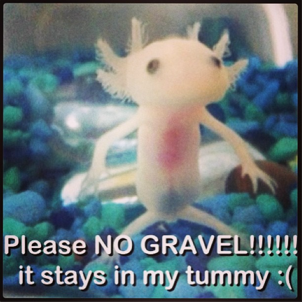 Amikor beléptem az állatkereskedésbe hogy kiválasszam az axiaimat láttam hogy hogyan is tartják ott őket. Még egy borsószemnél is kissebb kavicsok voltak ott. Amikor a kis axim kakilt egy hatalmas kavicstömkeleg kisérte ürülékét.