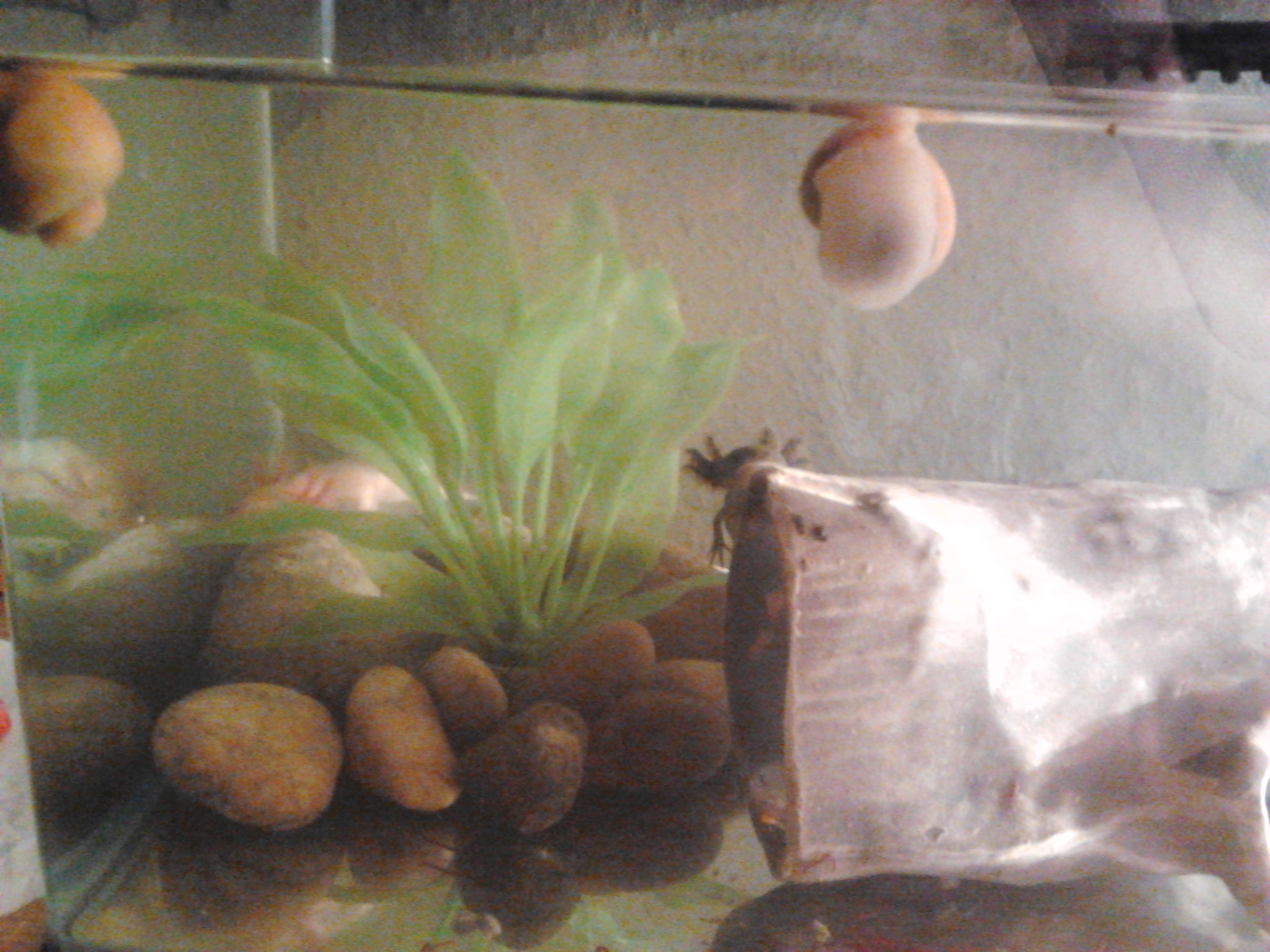 Nemrégiben haza is értünk az új helyre, ami úgy tűnik tetszetős a piciknek. Bátrak, nem félnek, ha hozzájuk érek, sőt, meglepődtem, de előbb elfogadták a kezemből a hamit, mint csipeszről. :O A vörös szúnyoglárva finom..még nyammogunk rajta, bezzeg a vízibolha..abból jutott mindenhová :) Holnap már pucolászhatom az aljzatot :)
