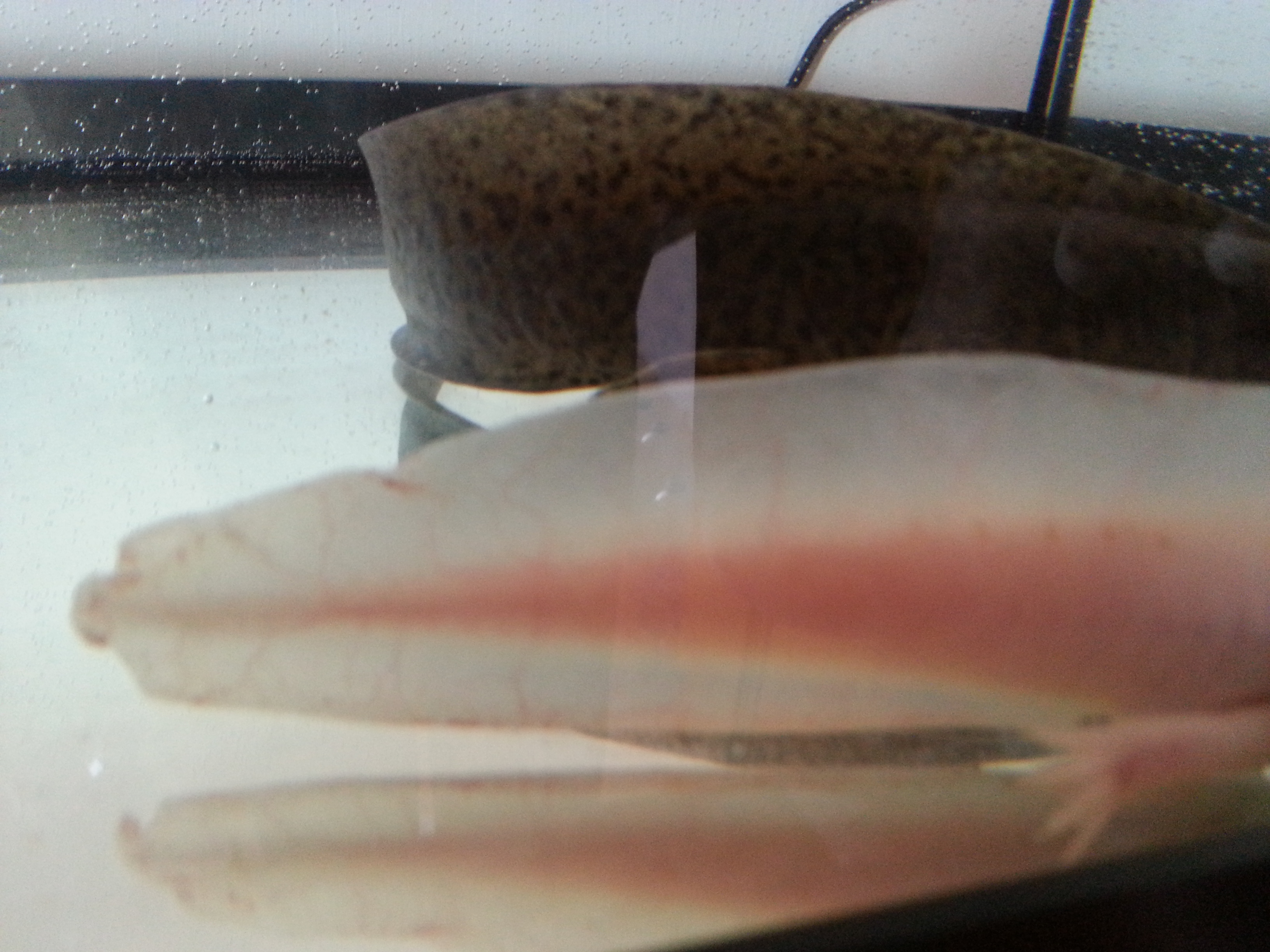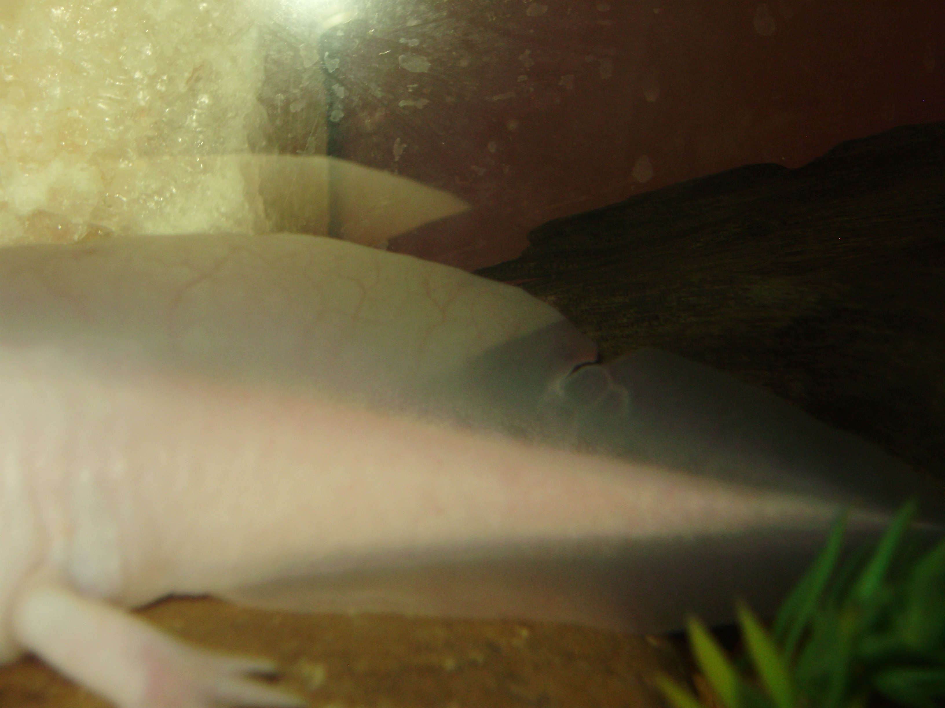 Ja és ezzel egy időben észrevettem, hogy a vadasomnak olyan, mintha valaki ollóval belevágott volna a farkába. Azt nemtudom hogyan és mikor keletkezett neki, de ő is szépen beforrasztotta magának.Monique írta:Nekem nyáron volt balesetem a fehér axival. Takarításnál szerettem volna másik edénybe átrakni, de annyira kapálózott és ugyebár csúszós, én meg finoman fogtam, hogy végül csak kiugrott a kezemből, kb 1 métert zuhant, a hátán feküdt és csapkodott amég utána nem nyúltam. A farka vége sérült meg és kitágultak a vérerei, a képen nem túl jól, de látszik valamennyire. Az a kis hátsó rész fityegett neki, zavarta is, mert libegett-lobogott összevissza. Én azt hittem le fogja dobni, de nem, hanem visszaépítette magának, és szépen kipótolta a "hiányzó részeket". Azóta már el is felejtettük mindketten, hogy történt volna bármi is :)