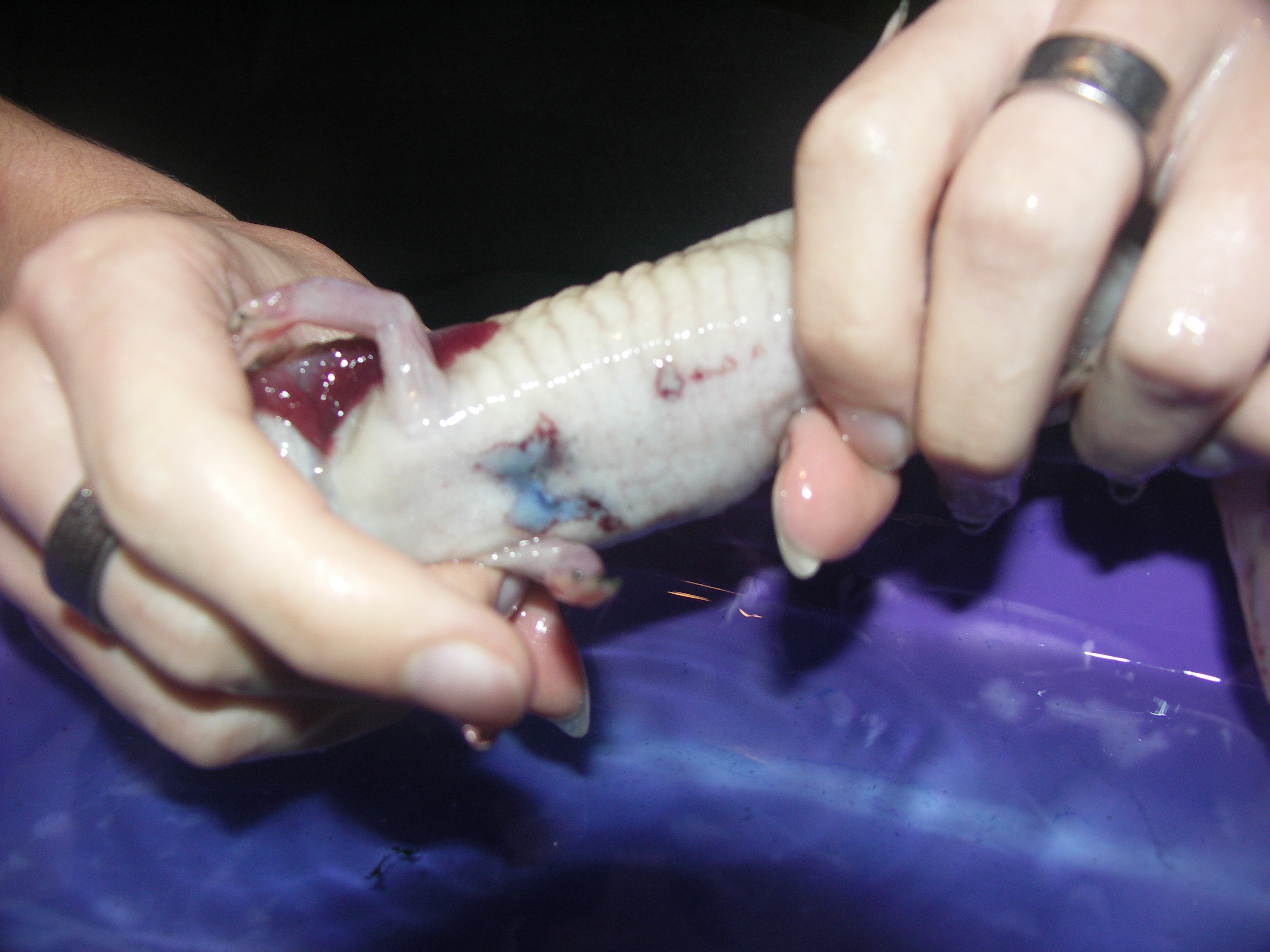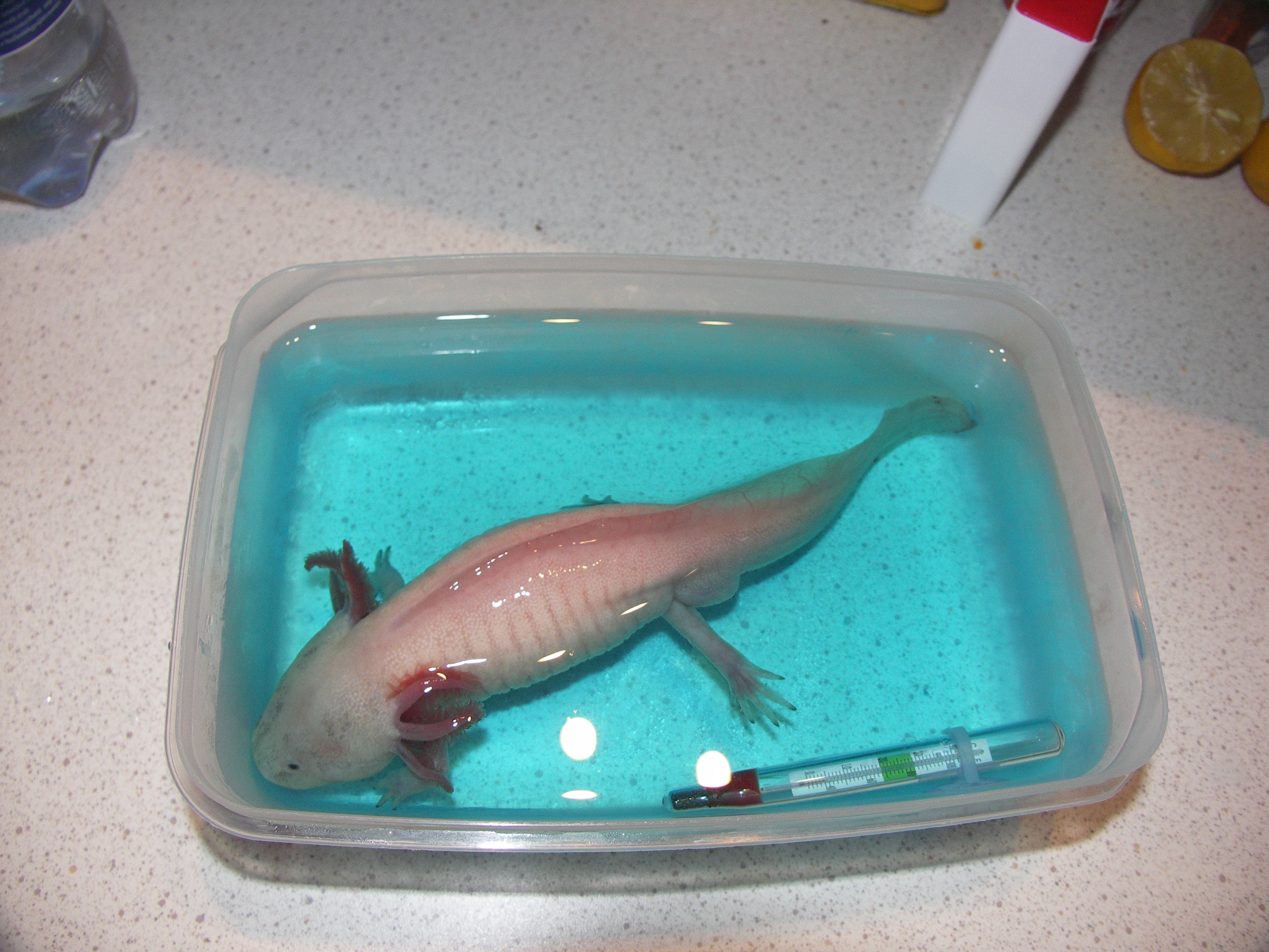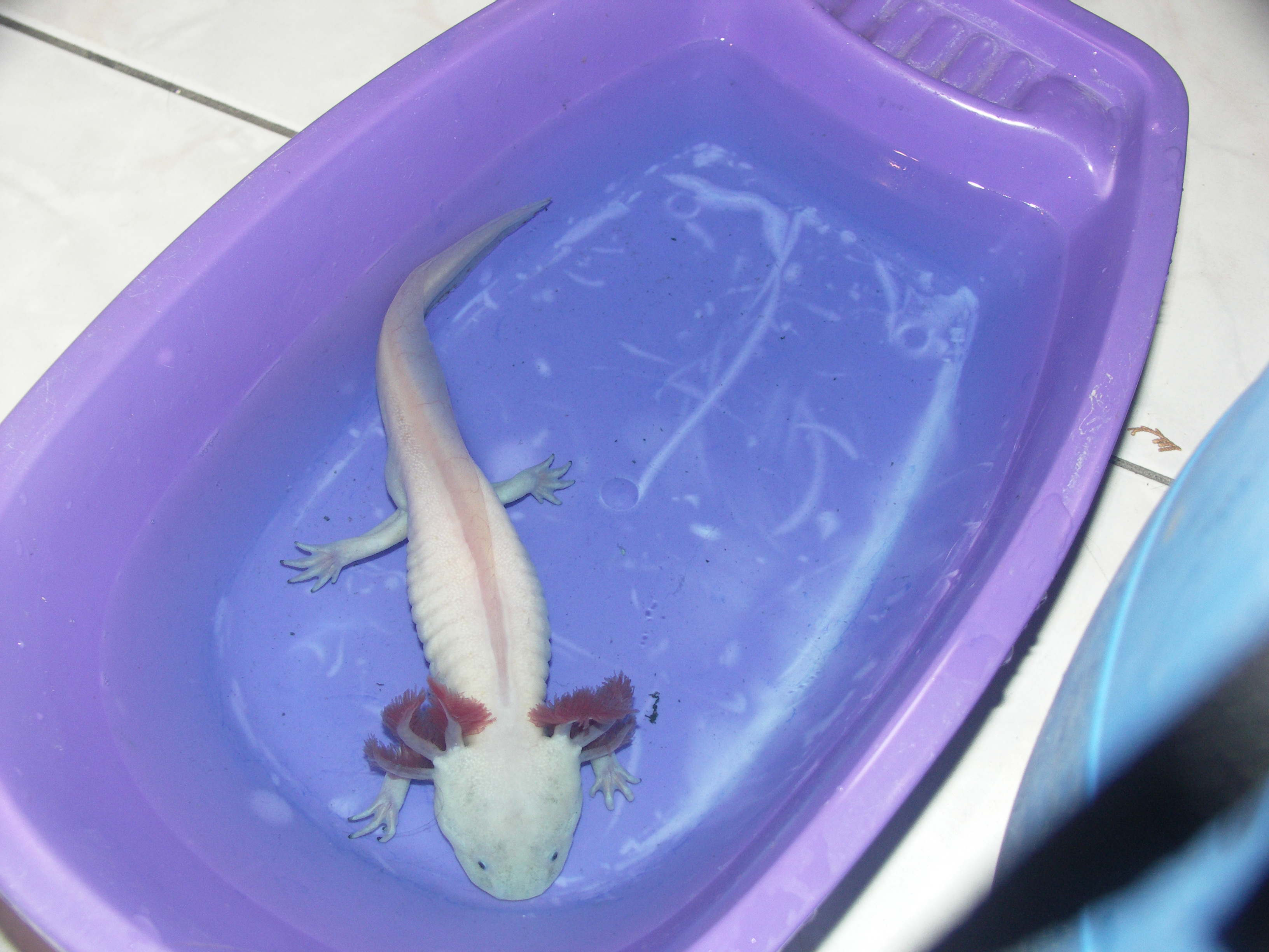 Nekem nyáron volt balesetem a fehér axival. Takarításnál szerettem volna másik edénybe átrakni, de annyira kapálózott és ugyebár csúszós, én meg finoman fogtam, hogy végül csak kiugrott a kezemből, kb 1 métert zuhant, a hátán feküdt és csapkodott amég utána nem nyúltam. A farka vége sérült meg és kitágultak a vérerei, a képen nem túl jól, de látszik valamennyire. Az a kis hátsó rész fityegett neki, zavarta is, mert libegett-lobogott összevissza. Én azt hittem le fogja dobni, de nem, hanem visszaépítette magának, és szépen kipótolta a "hiányzó részeket". Azóta már el is felejtettük mindketten, hogy történt volna bármi is :)