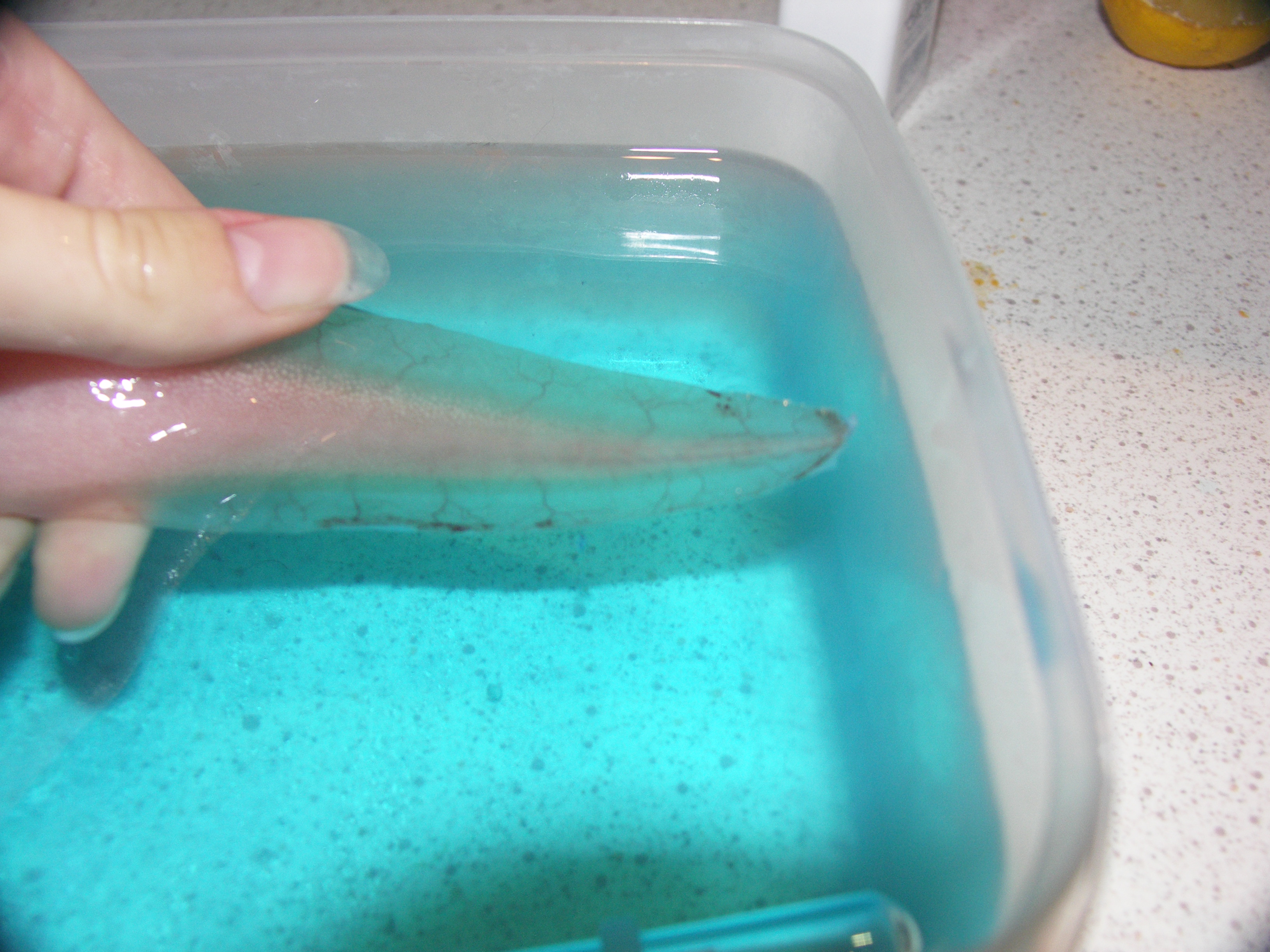 Rendben, szerintem is jobb lesz itt folytatni. Most lesz 2hete, hogy történt az eset, ma nagyon jól evett 10kis darab gilisztát kapott és még evett volna, tegnapelőtt 3darab kis májat, az étvágyával semmi baj, és talán sokkal jobb is mint előtte volt. A kopoltyúja rettentő szép, nem is tudom mikor volt ennyire nagy és élénk. Nagyon aktív, hatalmas hisztiket le tud vágni takarításkor és metilénezéskor, megfogni alig lehet. Még mindig van benne egy kis levegő, még mindig nem tud lent maradni, de imádja a jégakkut, egész nap alatta van, nélküle nagyon nyugtalan, enni is csak úgy hajlandó, ha alatta van vagy egy kicsit segítek a hátát lent tartani. Sajnos nincs akkora műnövényem és a bújó meg nem fért be az akváriumba, de szerintem így pont tökéletes neki is. A hasán a seb lassan gyógyulgat, megint volt széklete, kicsit megnyugodtam, hogy ha tud enni és emészteni remélhetőleg nincs semmi maradandó baja. Biztos vagyok benne hogy a hűtőzés mentette meg az életét. Mostani kép még állatkínzósabb mint a múltheti már mind két kezemre és segítségre volt szükségem a fotózáshoz.