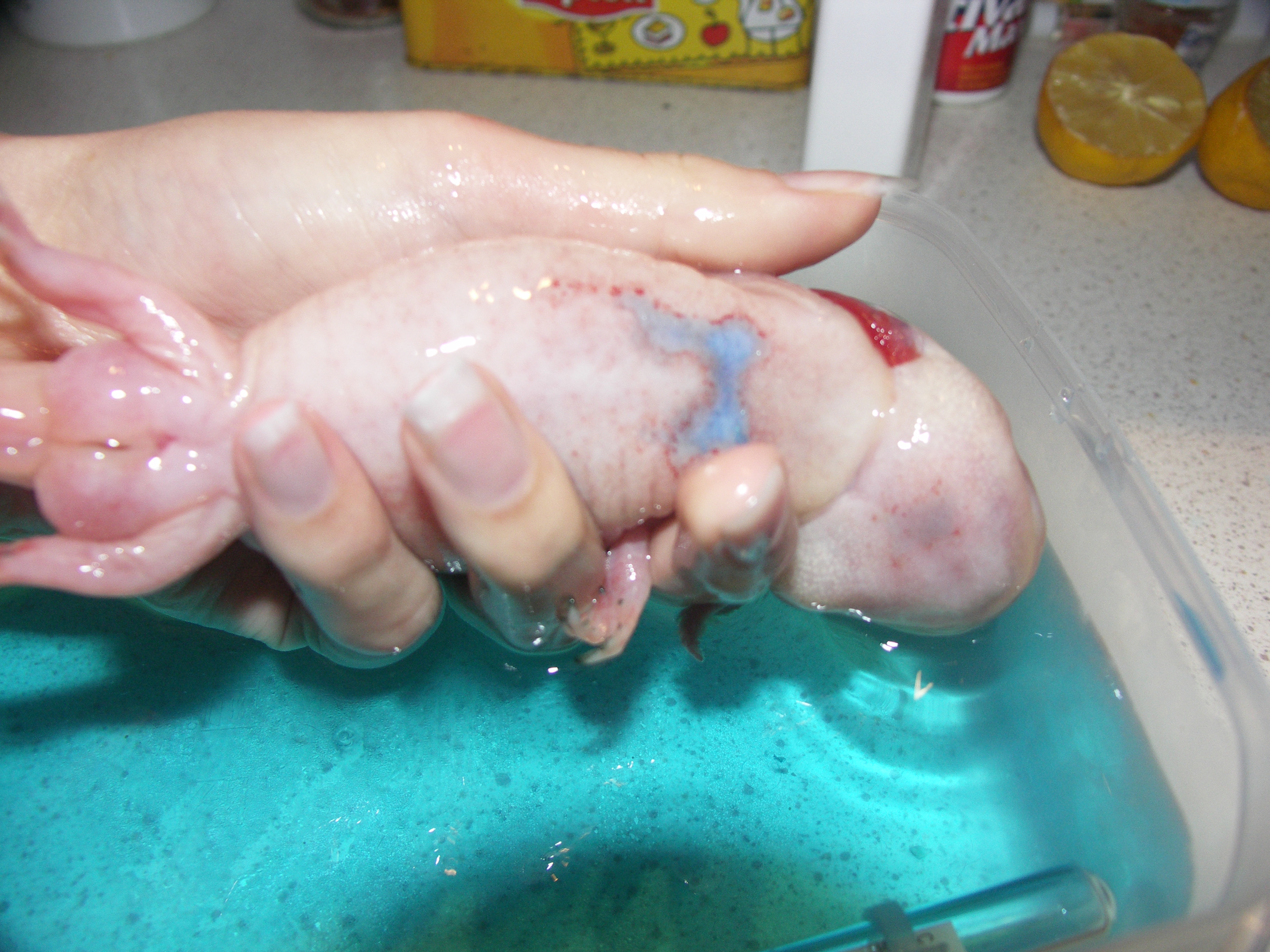 Sziasztok ismét. Lancelot megy a hűtőbe. Annyit javult az állapota, hogy a kopolyúi ismét rendesen állnak, néha mocorog és mozgatja a farkát. Viszont abban kérnék még egy pici segítséget, hogy metilénkéket tegyek a vízbe? Tényleg nem tudjuk, hogy most már gomba is van rajt, vagy az a bőre