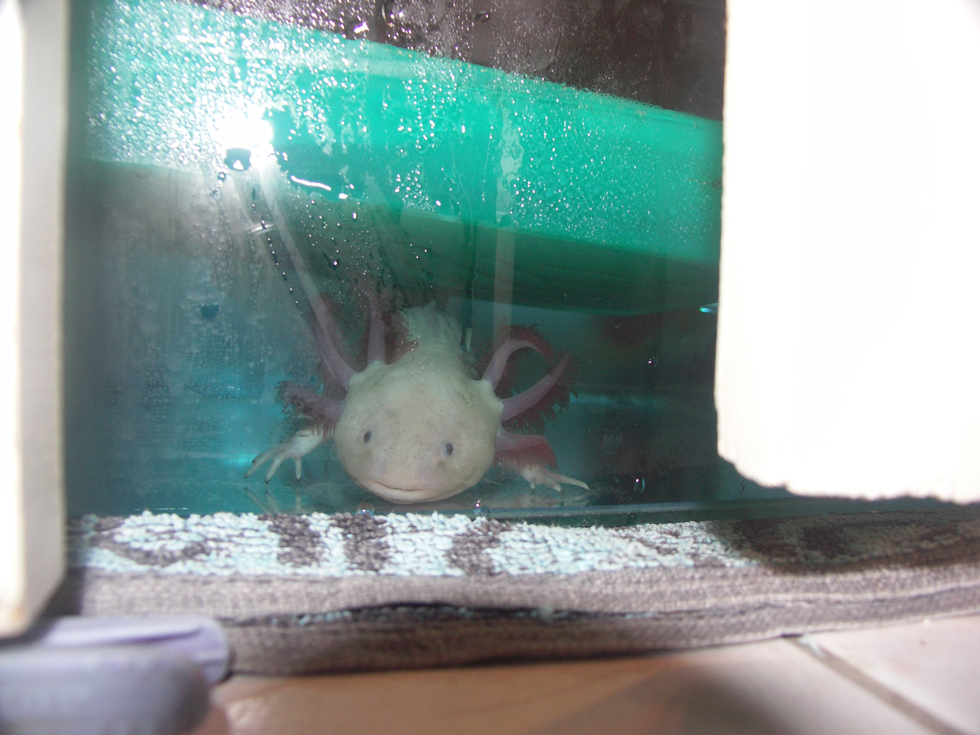 Nekem is sikerült a megszokott bakit elkövetnem. Takarítás után másnap mikor visszaraktam a kicsi pete korától felnevelt aximat, valami elterelte a figyelmem és elfelejtettem rárakni az akvárium tetejére az üveglapot ami rajta szokott lenni. Elég alacsony az akváriuma, ezért mindig figyelek, hogy rajta legyen. Erre egyszer megfeledkezem róla és már meg is történt a baj. Persze nem ébredtem fel rá. Szerencsére alacsony asztalon van és nem ment messzire se. Éjfél környékén még megvolt, és reggel 7kor találtuk meg.