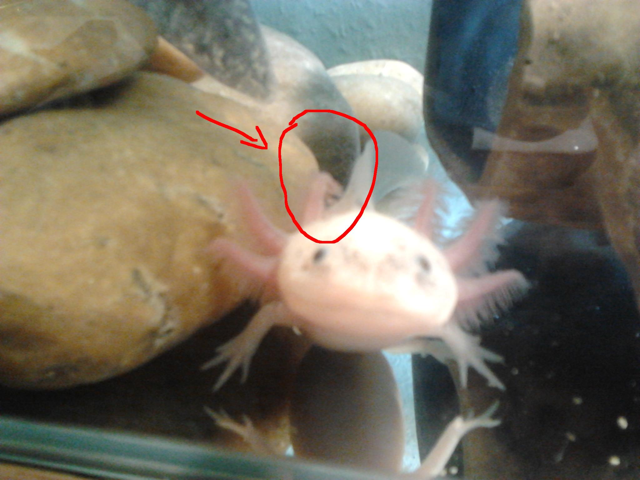 A kopoltyúja azt jelzi, hogy valami nincs rendben/nem tetszik neki. A halál előtti nyitott száj súlyosan beteg axiknál jellemző, olyanoknál amelyikeknél konkrétabb tünetegyüttes áll fent (kilóg az állat fél bele, foszlik, megette a gomba az állatot, ceruza vékony a teste stb.).