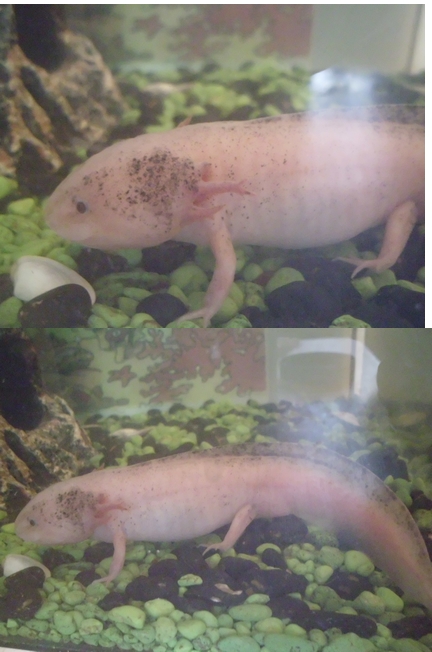 A kopoltyújával baj van, az biztos. Egyszer elég sokáig nem lettek takarítva (gyakran feljöttek levegőért, lebegtek is már a végén, mire észrevettük, hogy baj van) Miután vizet cseréltem nekik, ügyeltem arra, hogy mindig tiszta maradjon a vizük. Naponta leszívtam és friss vízzel töltöttem az akvárium felét. Azonban a kopoltyúk nem igazán nőttek vissza, már több hónap eltelt, de már szőrök sincsenek rajta nagyon. És egyre több a fekete folt is a testén, ami nem tudom, normális-e vagy valami betegség. Van egy fekete axim is, azon meg fehér foltok vannak, de én nem látom vattaszerűnek...