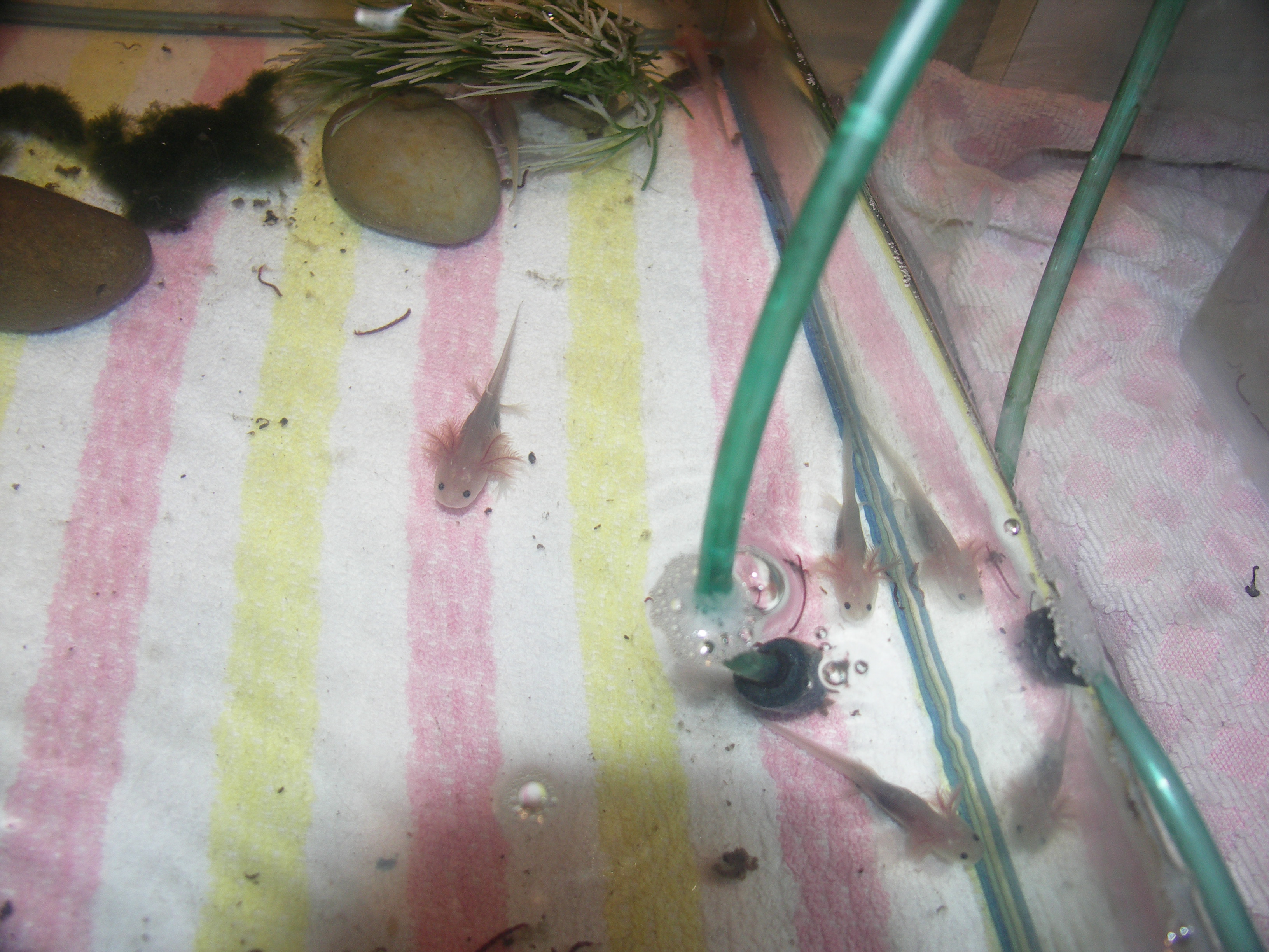 Most egy hónaposak a kicsik, mármint az első adag és rettentő kicsik még mindig. Nem tudom, hogy mekkora-hogyis néz ki egy egy hónapos axolotl, kicsit úgy érzem, hogy le vannak maradva szegénykéim. :( A legtöbbjüknek van már apró első lábacskája.