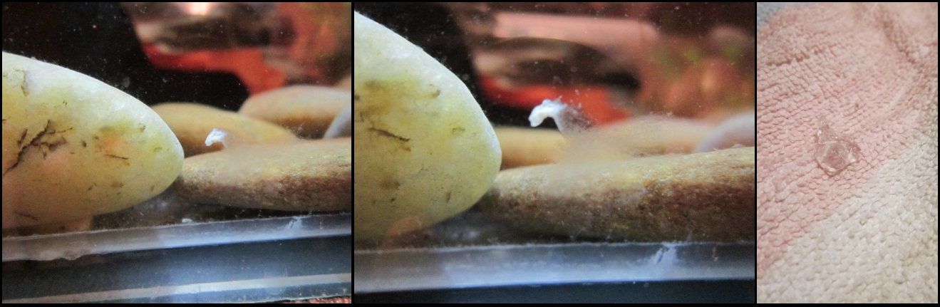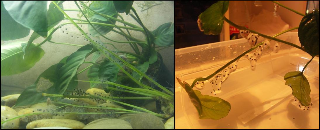 Második petézés: Siwon ismét gombás volt, így lehűtöttük, szombaton visszatettem, vasárnap már a peték vártak. (Siwonon kívül még van 2vadas fiúm is, de nagy valószínűséggel ő az apa) A petézés teljesen a múltkori ellentéte volt. Lomha, lusta, nem úszkált fel-alá. Jóval kevesebb nyálkával és jóval kevesebb petét rakott. Most nagyjából 150 kicsi született, lett néhány fura pete amikhez nem került burok, csak pete, ez nem tudom mitől lehet. Legutóbb mindegyik szinte ikerpár volt 2-3-4-5-ös ikerek is akár, most egy darab ikerpárunk sincs. Ebből is látszik mekkora különbség van petézés és petézés között.