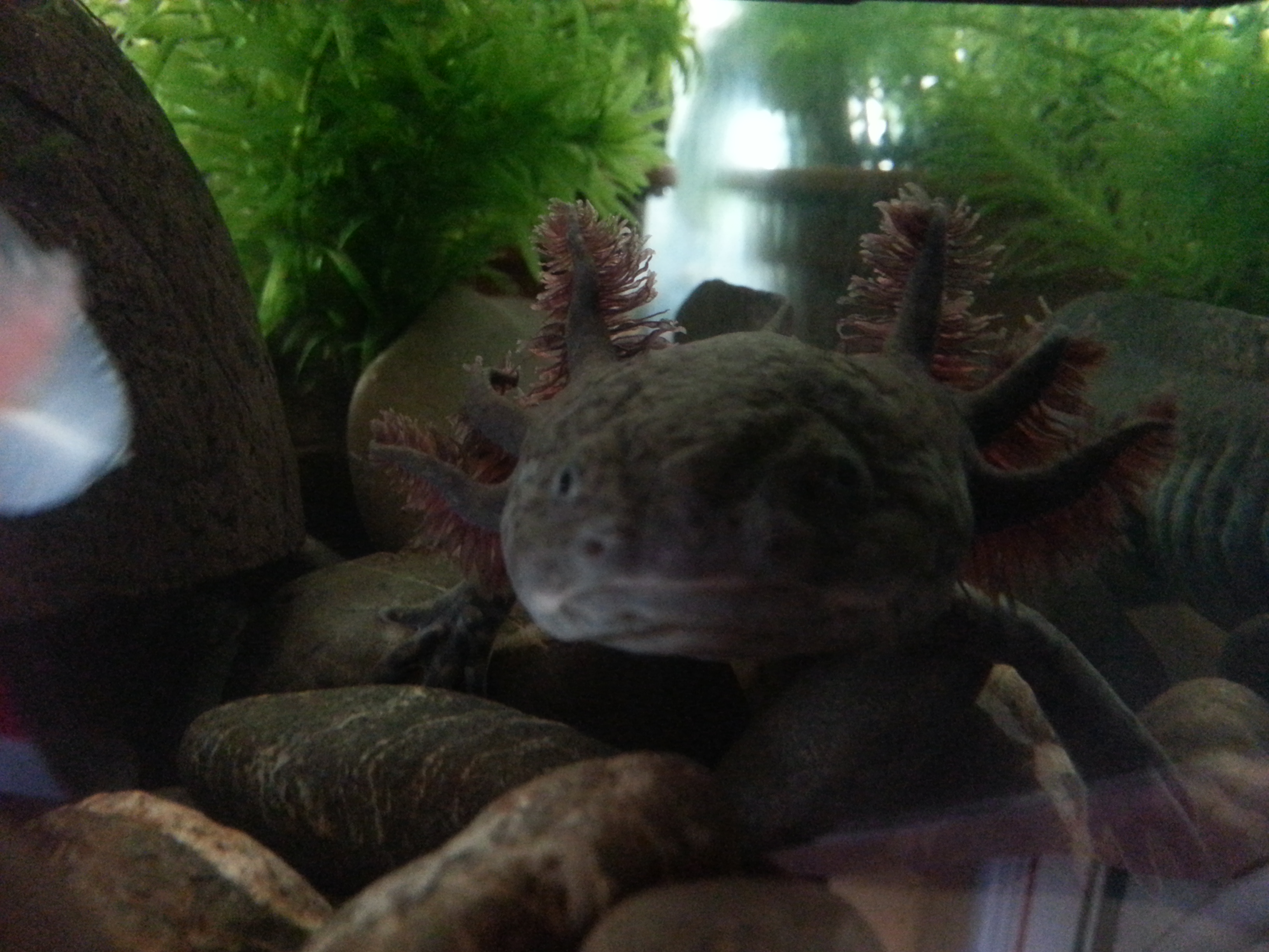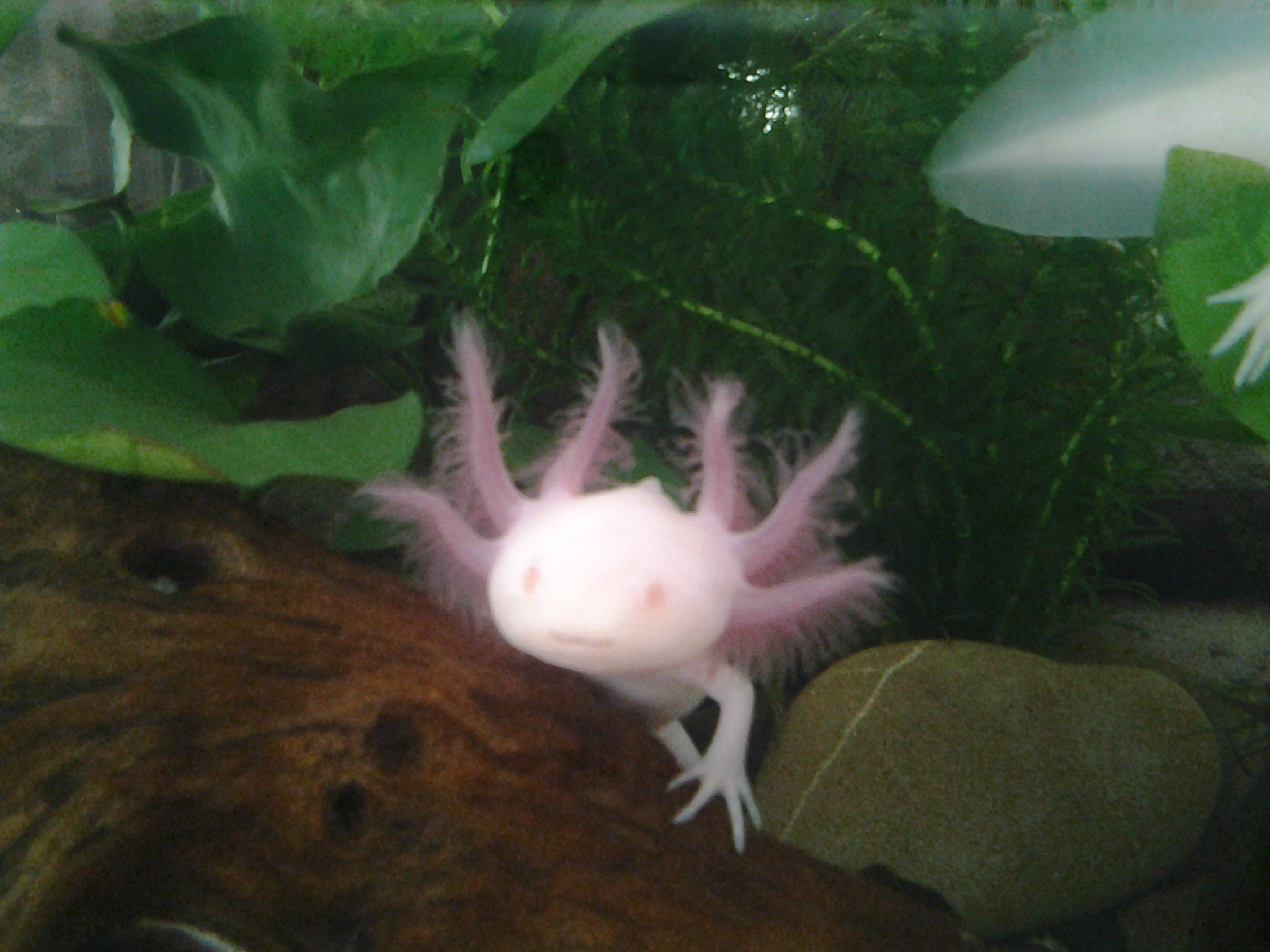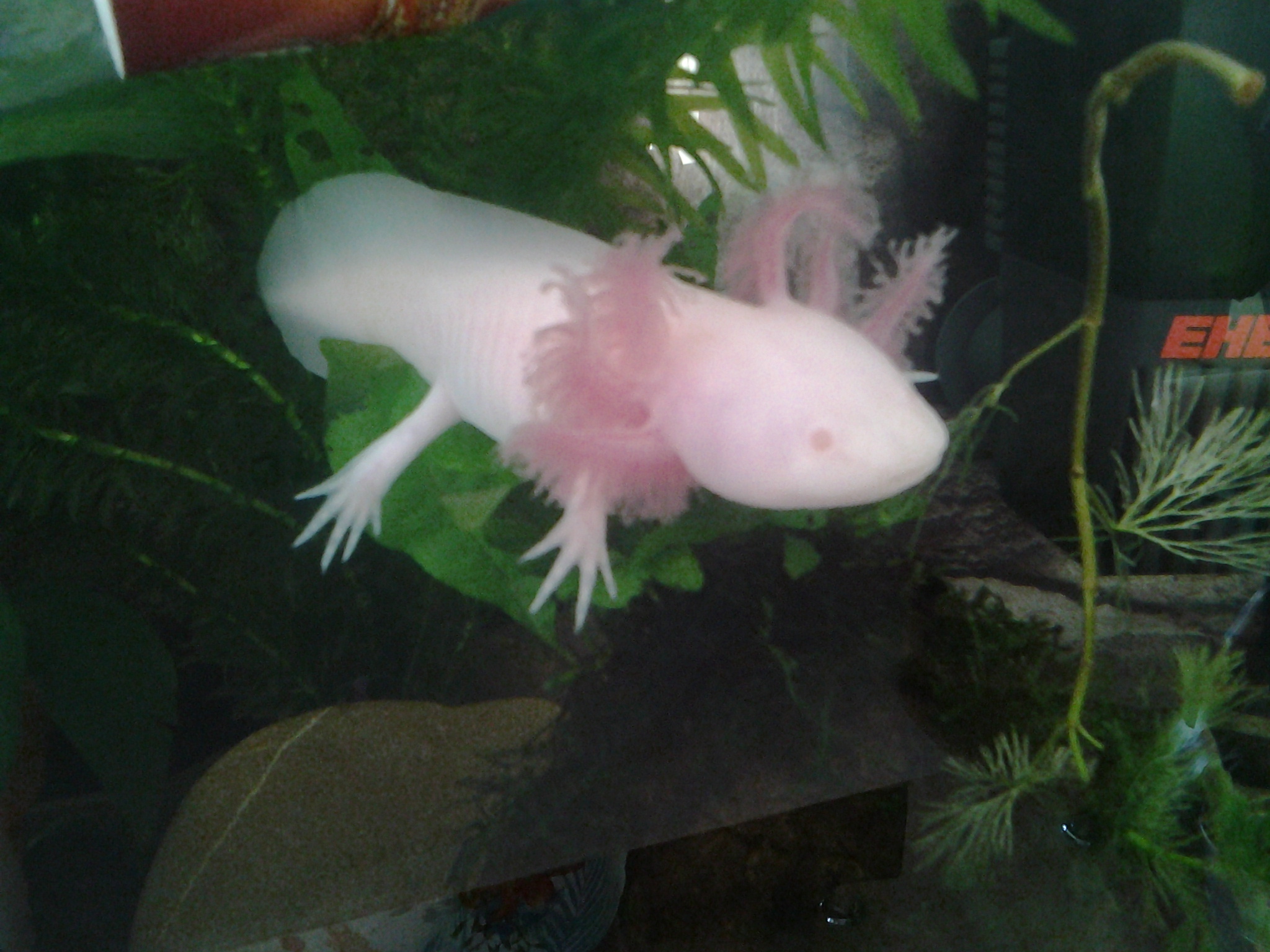 Elöször kb. 1 évvel ezelött láttam axolotlot, egyböl beleszerettem, de az eladó azzal kezdte, hogy ha axolotlot akarunk tartani, akkor mindenképp venni kell hütöberendezést az akváriumba, ami 700-900 euro körül lenne, így fájó szívvel de lemondtam róla, de ha valahol láttam öket, azért jó sokáig elnézegettem. Nemrég egy másik boltban az eladó kijelentette, hogy náluk még sosem ment hütés nélkül sem 22 fok fölé a víz, így kb. 2 hete a párom meglepett 2 albino axival. Mivel én már azt hittem sosem lesz nekem, elözöleg nem néztem utána semminek, úgyhogy rögtön kezdetben jó sok hibát elkövettem, rossz követ tettünk be, rossz növényeket, rossz kaját vettünk, de szerencsére rátaláltam a fórumra, így átesve a kezdeti nehézségeken és az elsö gombán, végre minden rendben és az axik látszólag boldogok.