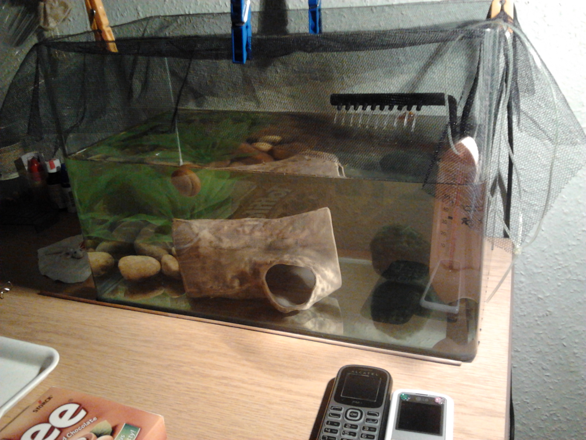 Nemrégiben haza is értünk az új helyre, ami úgy tűnik tetszetős a piciknek. Bátrak, nem félnek, ha hozzájuk érek, sőt, meglepődtem, de előbb elfogadták a kezemből a hamit, mint csipeszről.A vörös szúnyoglárva finom..még nyammogunk rajta, bezzeg a vízibolha..abból jutott mindenhová :) Holnap már pucolászhatom az aljzatot :)