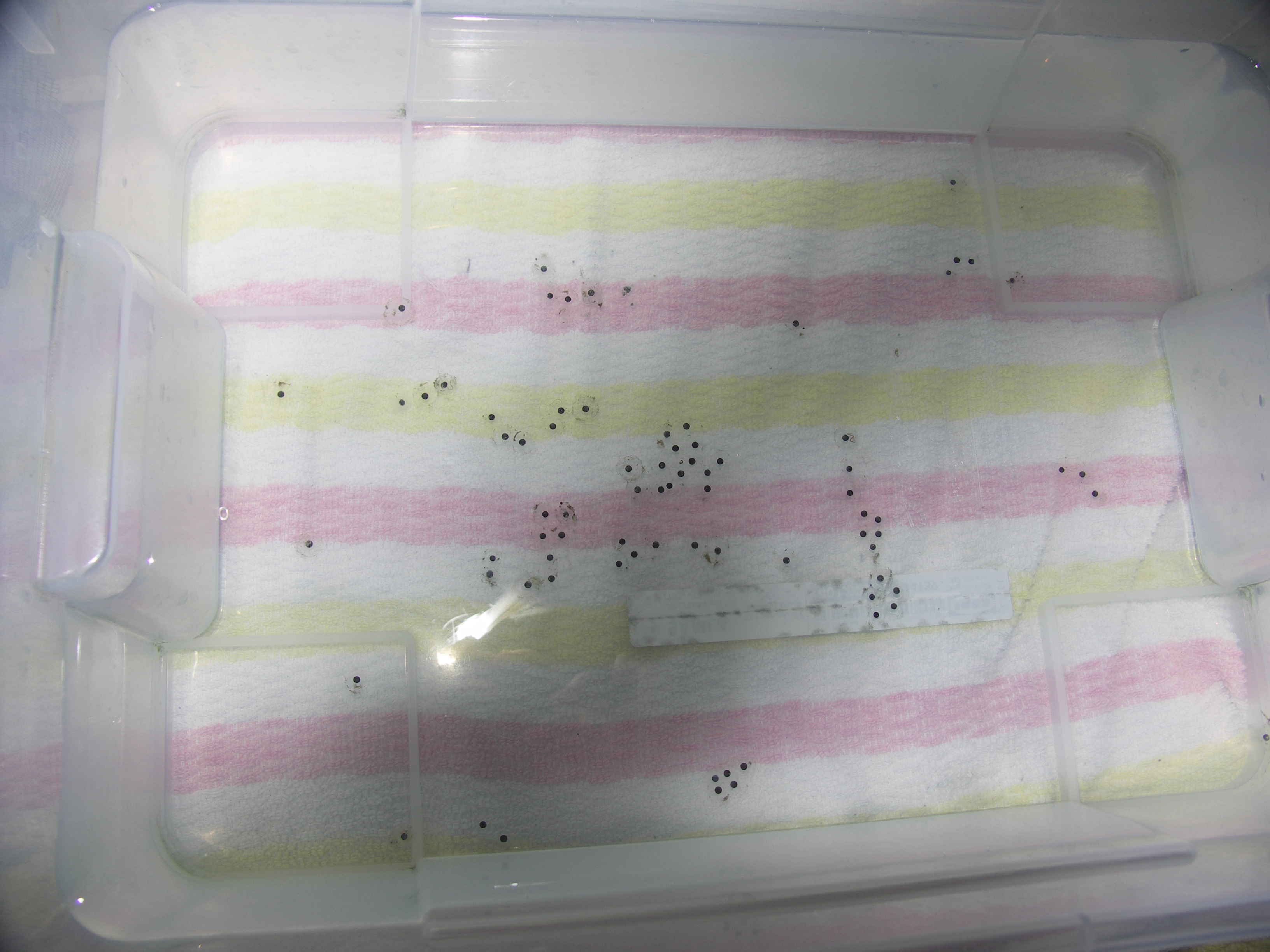 Második petézés: Siwon ismét gombás volt, így lehűtöttük, szombaton visszatettem, vasárnap már a peték vártak. (Siwonon kívül még van 2vadas fiúm is, de nagy valószínűséggel ő az apa) A petézés teljesen a múltkori ellentéte volt. Lomha, lusta, nem úszkált fel-alá. Jóval kevesebb nyálkával és jóval kevesebb petét rakott. Most nagyjából 150 kicsi született, lett néhány fura pete amikhez nem került burok, csak pete, ez nem tudom mitől lehet. Legutóbb mindegyik szinte ikerpár volt 2-3-4-5-ös ikerek is akár, most egy darab ikerpárunk sincs. Ebből is látszik mekkora különbség van petézés és petézés között.