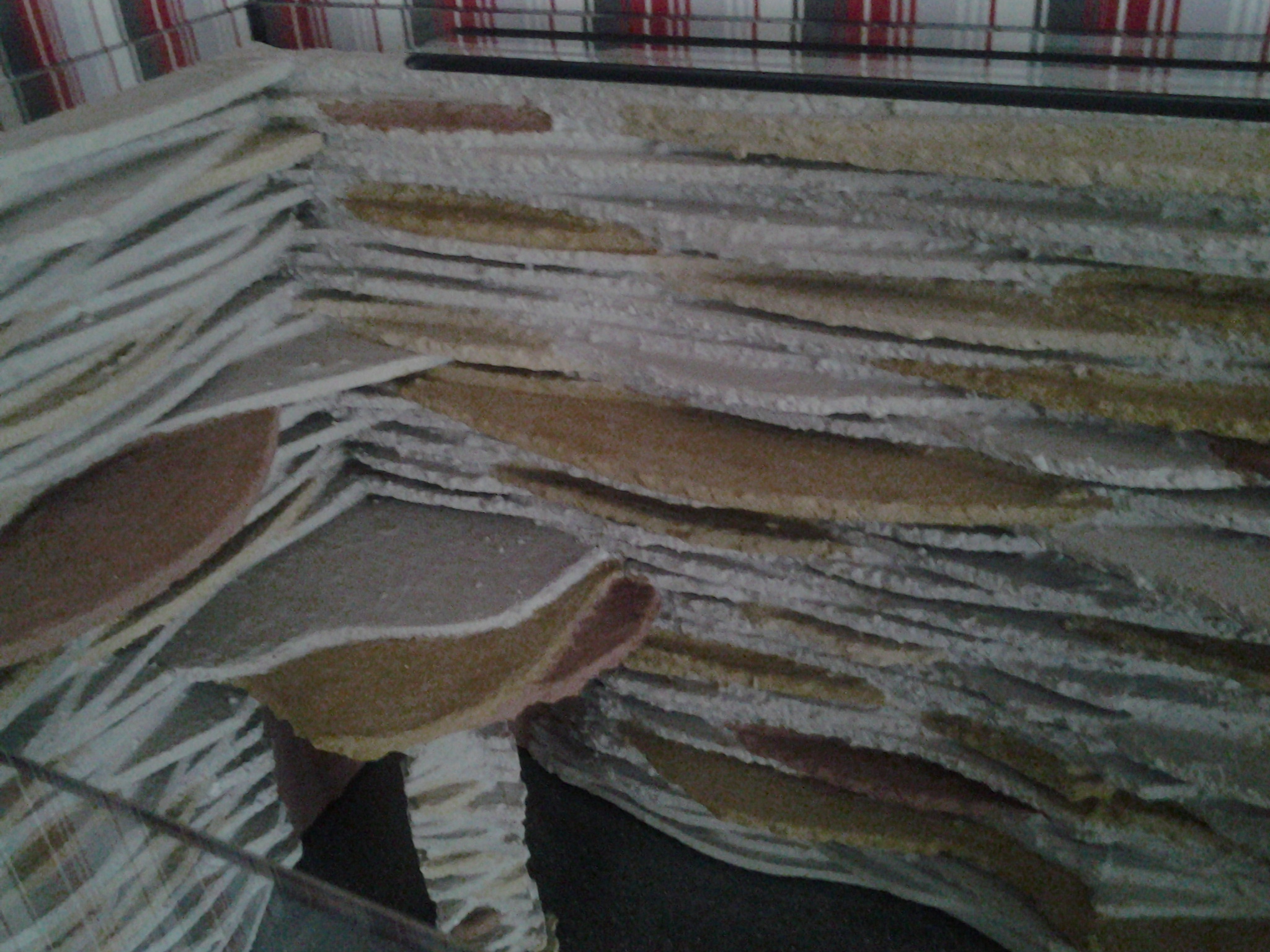 Ha szeretnénk a formán kicsit alakítani, akkor sűrű flexragasztóval másnap még alakíthatunk, tunkolási technikával recés kőmintás felszínt hozhatunk létre. Ezek után jöhet a színezés. A porokat jól dolgozzuk bele a flex ragasztóba. Amíg szemcsét látunk, addig nem jó. Jellemzően 5 perc kevergetés pár perc pihentetés, ismét keverés után adja ki a színét rendesen. A keverőtál alját is alaposan kenjük át, mert a felső vizes réteg nem színeződik látszólag annyira és leülepszik a festék pigmentje. A szín meghatározásánál azt vegyük figyelembe, hogy kikeverve nedvesen milyen. Olyan lesz a vízben is. Ne essünk abba a hibába, hogy másnap kiszáradva világosszürke amit mi feketének akartunk. A víz alatt sötét lesz. A nagyobb rétegek között 24 órát a kisebb felületi tunkolások apró minták között fél-egy órát várjunk. Ha elbizonytalanodunk, hogy milyen színt kéne most épp kevernünk hogy nézett ki az előző napi, akkor egy kis részt nedvesítsünk meg, fröcsköljünk rá vizet. Az utolsó festés után 24 órával célszerű az egészet bevinni a kádba és lezuhanyozni, kicsit ecsettel jól átfekélni, hogy a nem annyira odatapadt homokszemcsék lejöjjenek. Ilyenkor még előfordulhat hogy a festék kicsit színezi az ecsetet, ez természetes, addig kell áztatni majd és kefélni amíg már nem színeződik az ecset. Zuhanyozáskor látjuk a végeredményt, ilyen lesz a víz alatt, ha valahol alakítanál még akkor most látod, hogy hol kell.