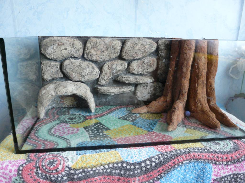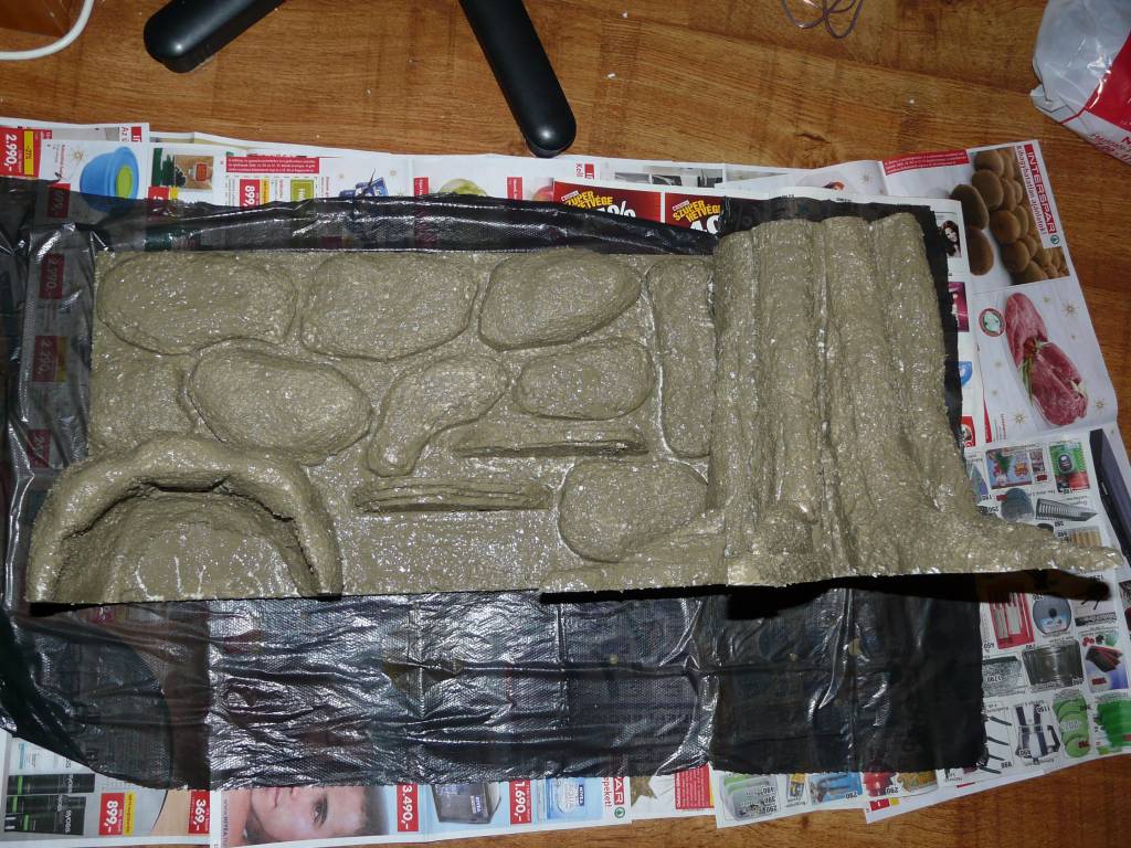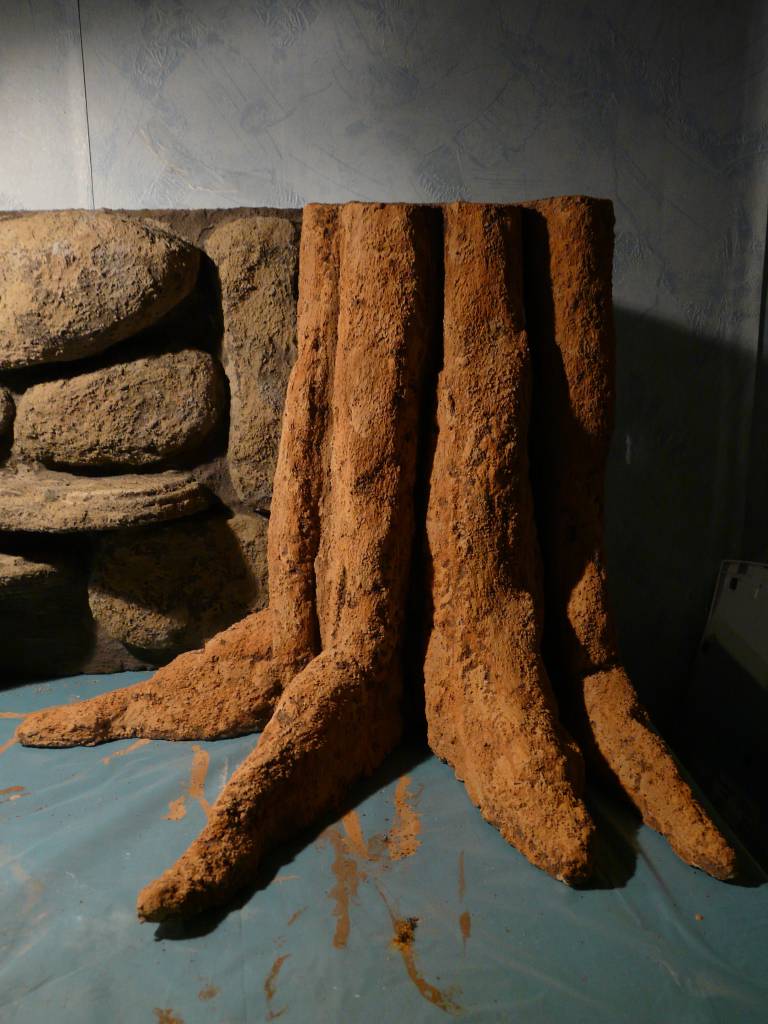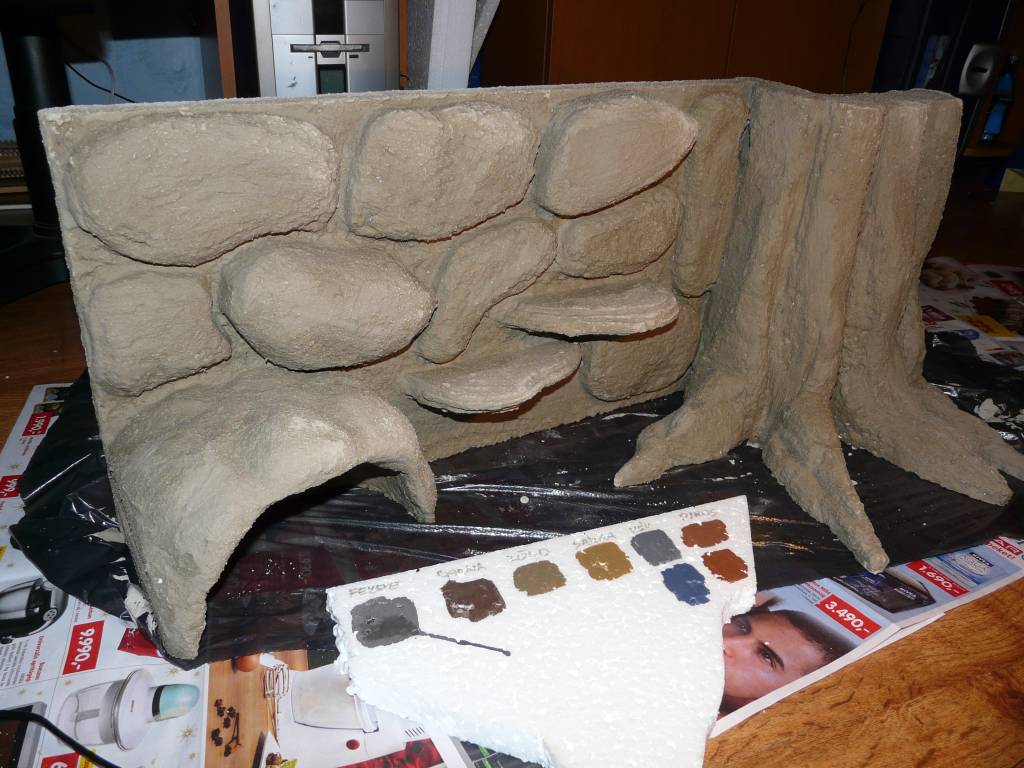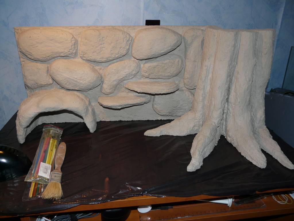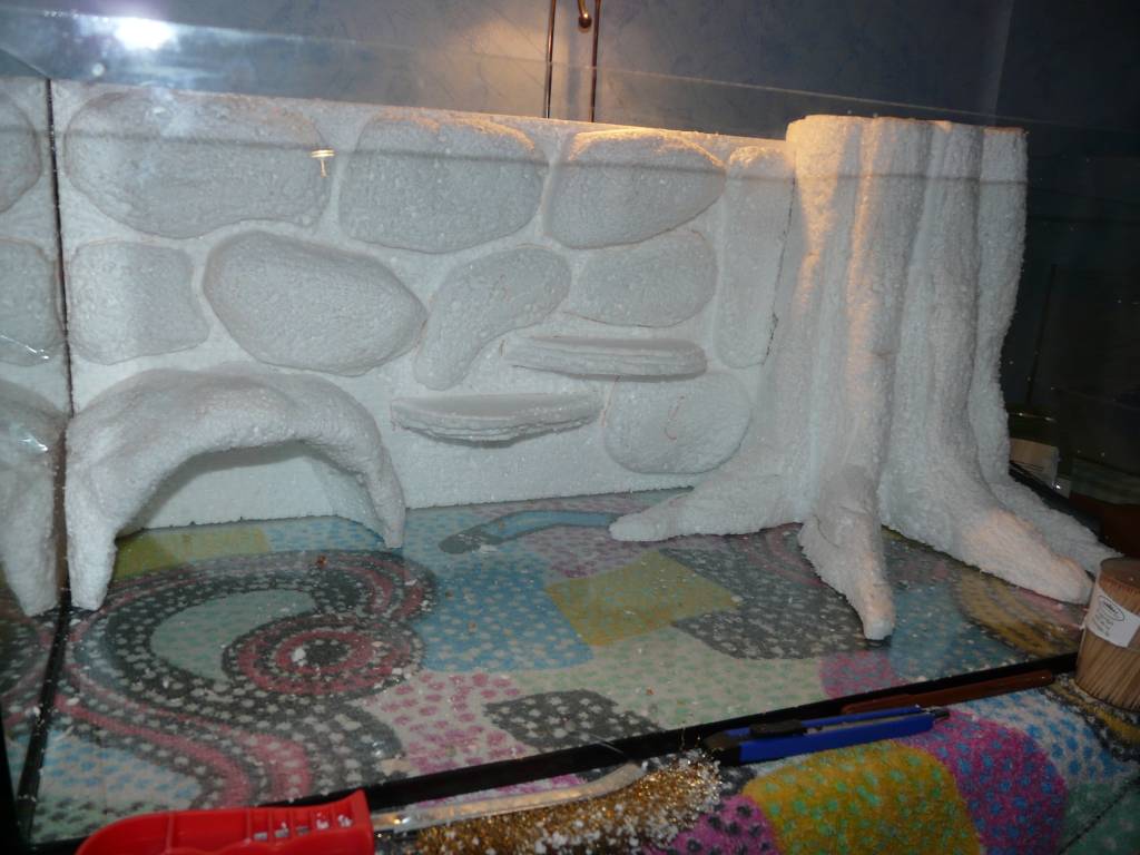 Ezzel a technikával igazából bármit elkészíthetünk, barlangot, gyökeret, fatörzset, kőmintázatot, akár aljzatot is. Egy a lényeg, hogy végül le kell majd ragasztani, mert a polisztirol miatt felúszna a felszínre.