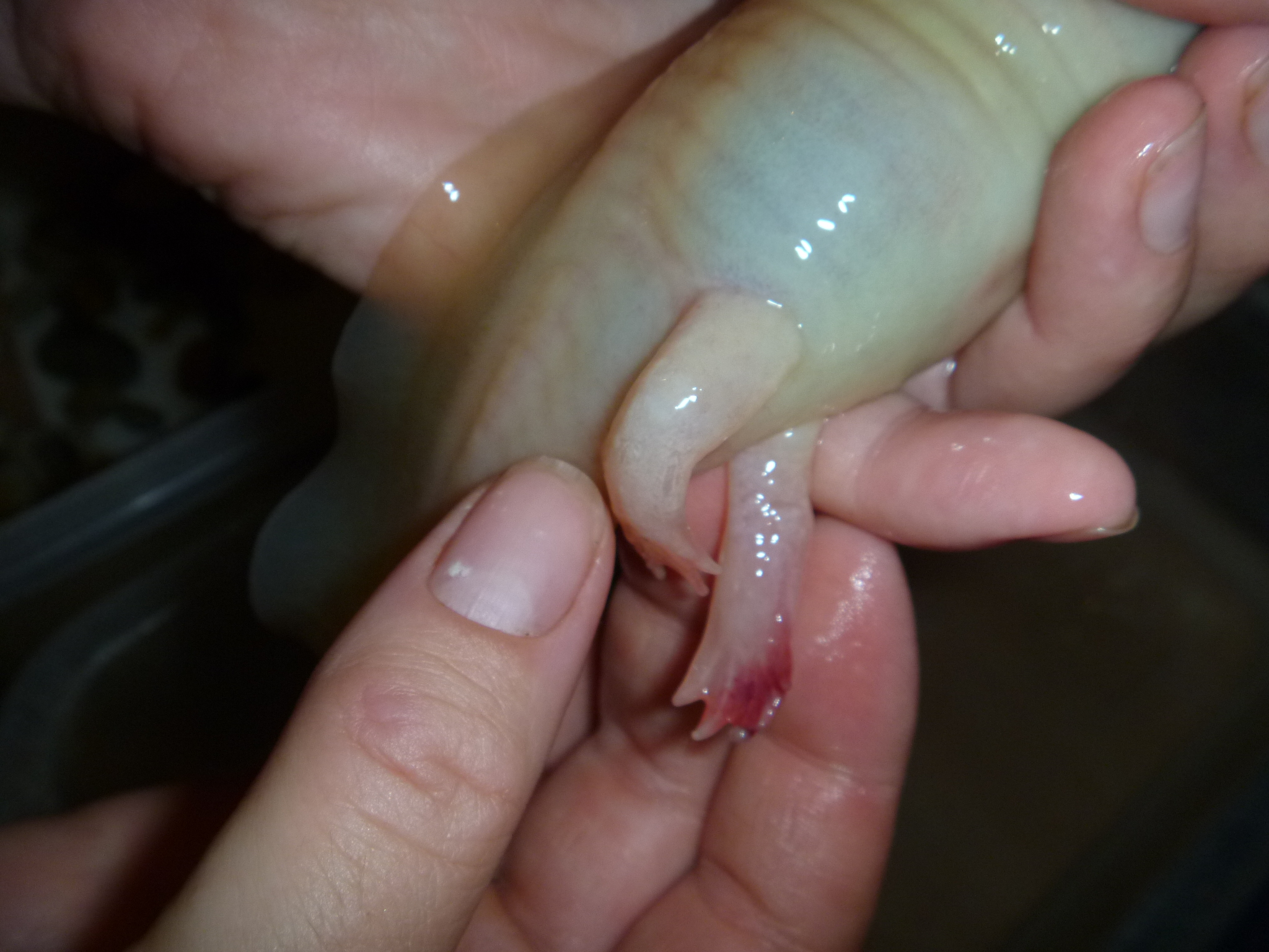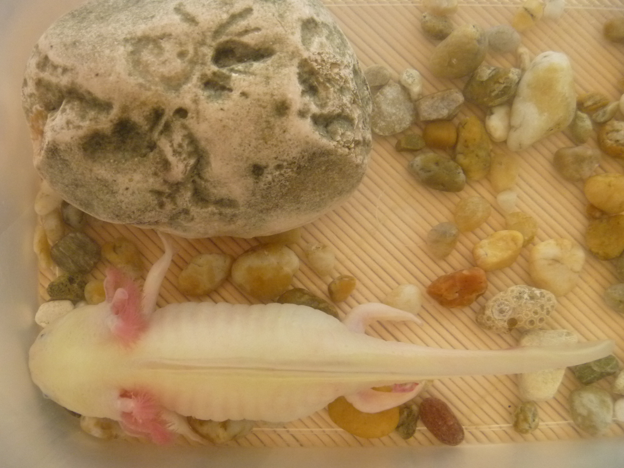Axim kb. 10 hónapja él velünk. Eddig semmilyen problémája nem volt, egyedül lakik, sérülést okozó tárgyak, éles dolgok nincsenek az akváriumában. A kánikulai héten kezdődtek a problémák. Sajnos nem voltunk itthon, mikor hazaértünk azt mondta a vigyázónk, hogy axi kb. 6 napja nem evett és lebeg. Úgy tűnt, mintha fél oldala lebénult volna, mert kicsit megdőlve lebegett. A lábán bevérzések voltak, amit nem tudok mitől szerezhetett. Kopoltyúi szép pirosak voltak, de nem nagyon reagált semmire, akár meg is foghattam. A vize sajnos eléggé felmelegedett és a levegőztető sem fújt buborékot, csak keverte a vizet. Első körbe próbáltam hűteni a vizet, majd mégis inkább a teljes akváriumtakarítás következett. Ettől kezdve minden nap hűtöttem a vizét és egy részét lecseréltem. Két nap múlva kicsit javult az állapota, már használta mindkét mellső lábát, gyakran változtatta a helyét, majd jött a visszaesés. Ismét féloldalt lebegett, néha farokkal felfelé, fejjel lefelé volt, továbbra sem evett. Egyik nap arra jöttem haza, hogy az aljzaton van, de sajnos nem sokáig örültem, mert amikor megpróbált feljutni, nem mozogtak a hátulsó lábai és a mellső lábaival evezve egyhelyben állt. Ekkor döntöttem a hűtőzés mellett, mert féltem, hogy nem tud feljönni és esetleg megfullad, illetve a lábujjain lévő bevérzések is nőttek és már egyáltalán nem reagált az érintésre.