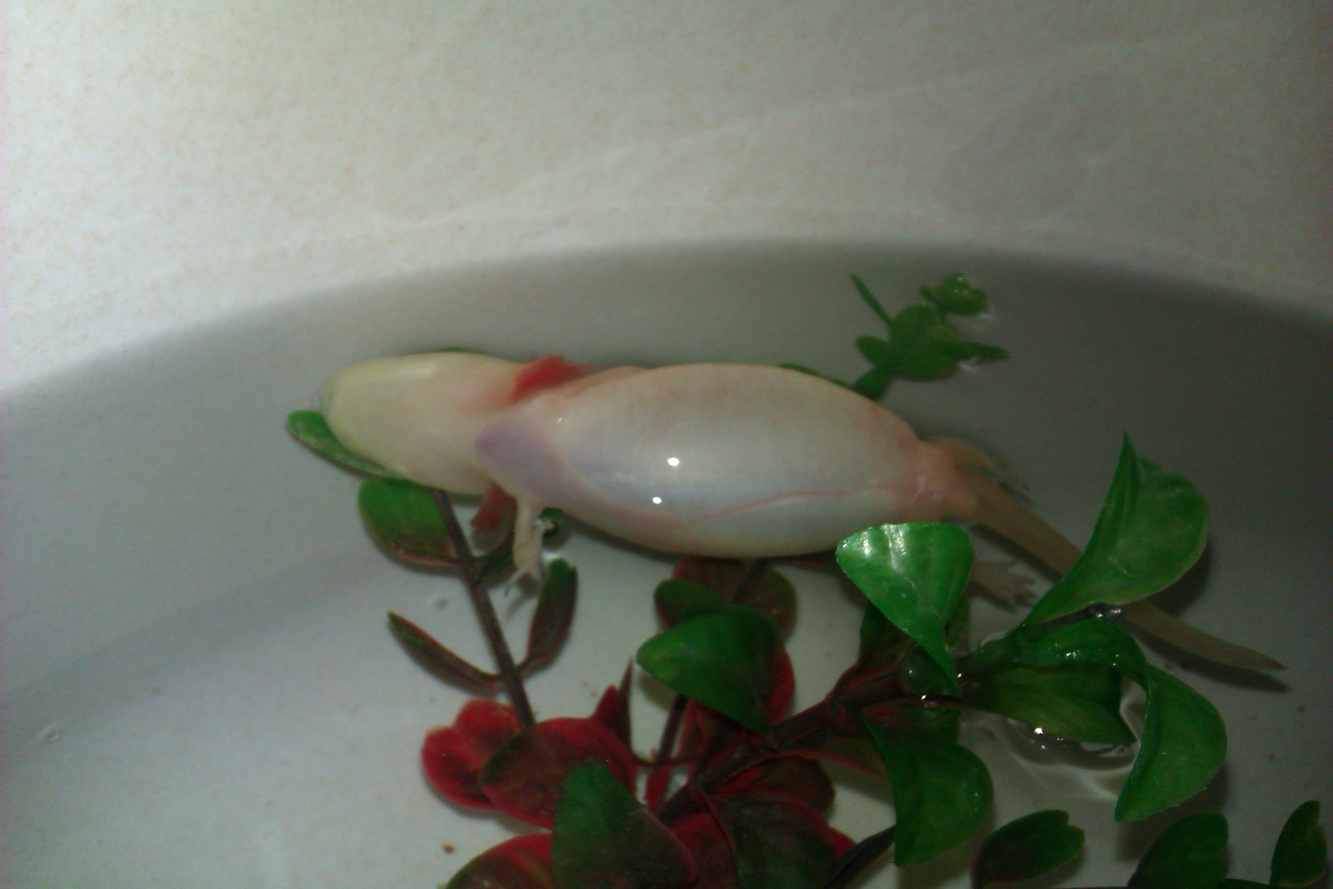 Kb. 1 hónapja vettem egy axit, kb. 10 centis lehet, a színe nem teljesen albínó, inkább fehéres, a fején fekete pöttyök, a kopoltyúja pirosas, de a teste inkább fehér. (Nem tudom lényeges-e, de Budapesten vetten az Árkádban, az Állatker-ben.) Eddig nem volt semmi gond, azonban ma vettem egy növényt, beletettem az akváriumba és utána az axi elkezdett lebegni (nem tudom a növény lényeges-e...). Egyszer a feje megy felfele, egyszer a farka. Úgy kb. 5 percenként nyeldes, nem tudom ez mit jelent. Egyszer olyat is láttam, mintha öklendezett volna, aztán egy kis kaja maradék jött ki.