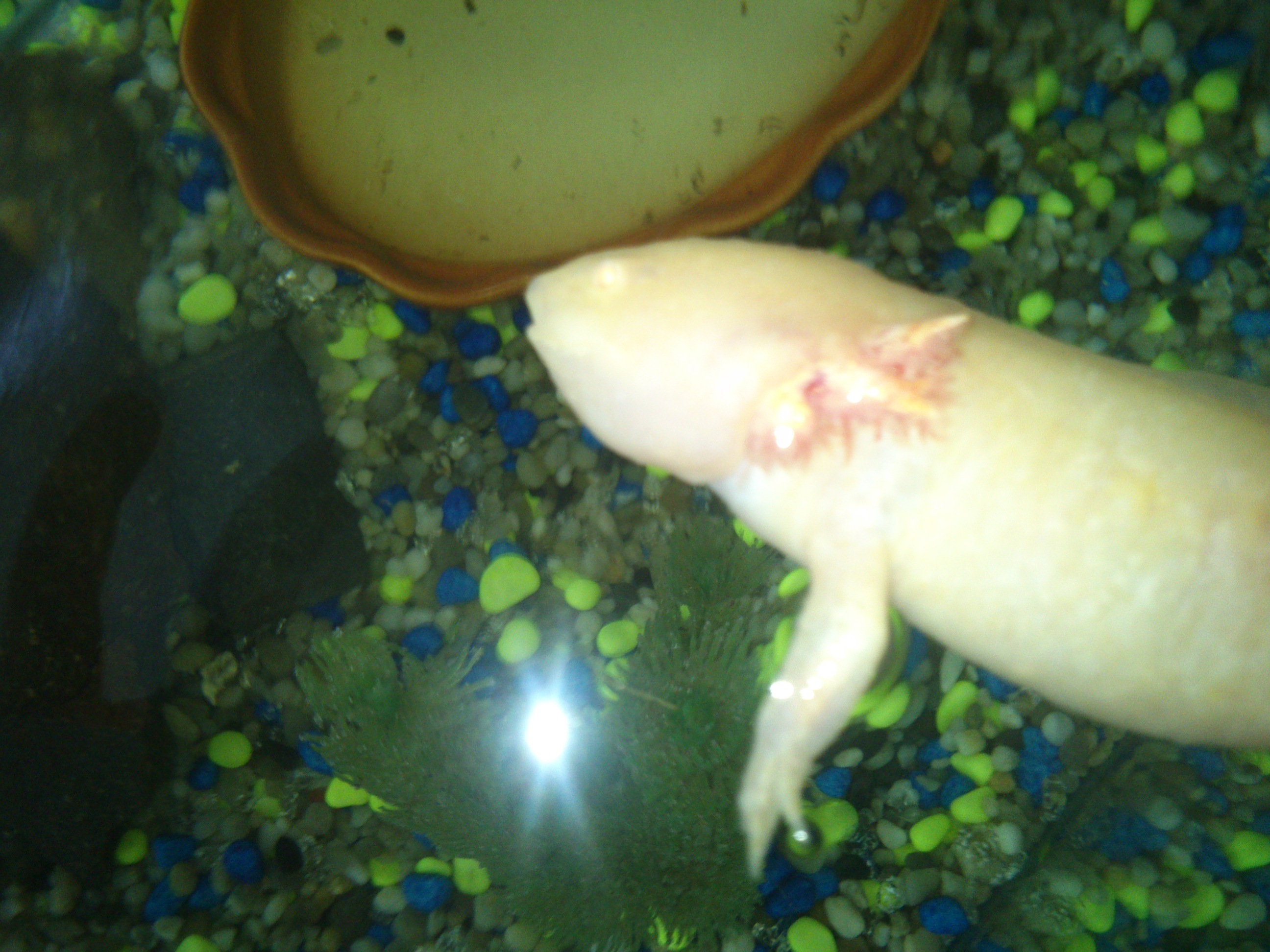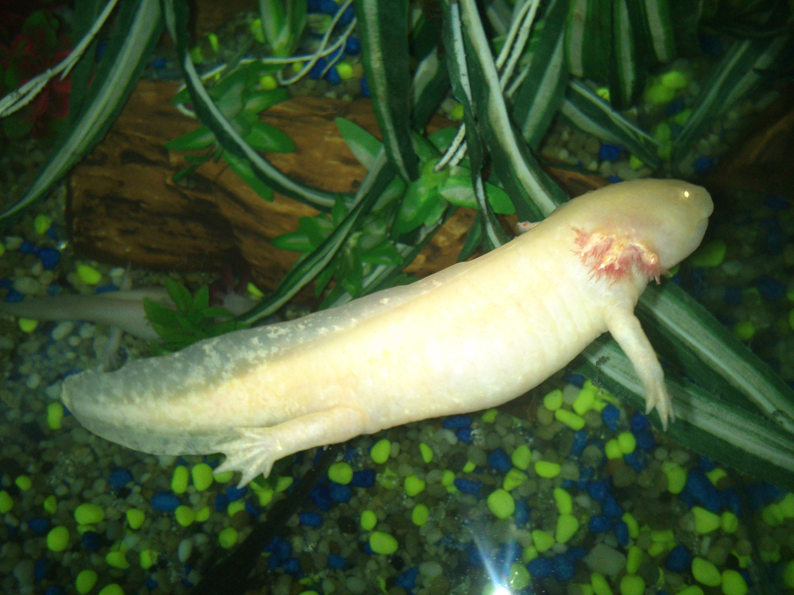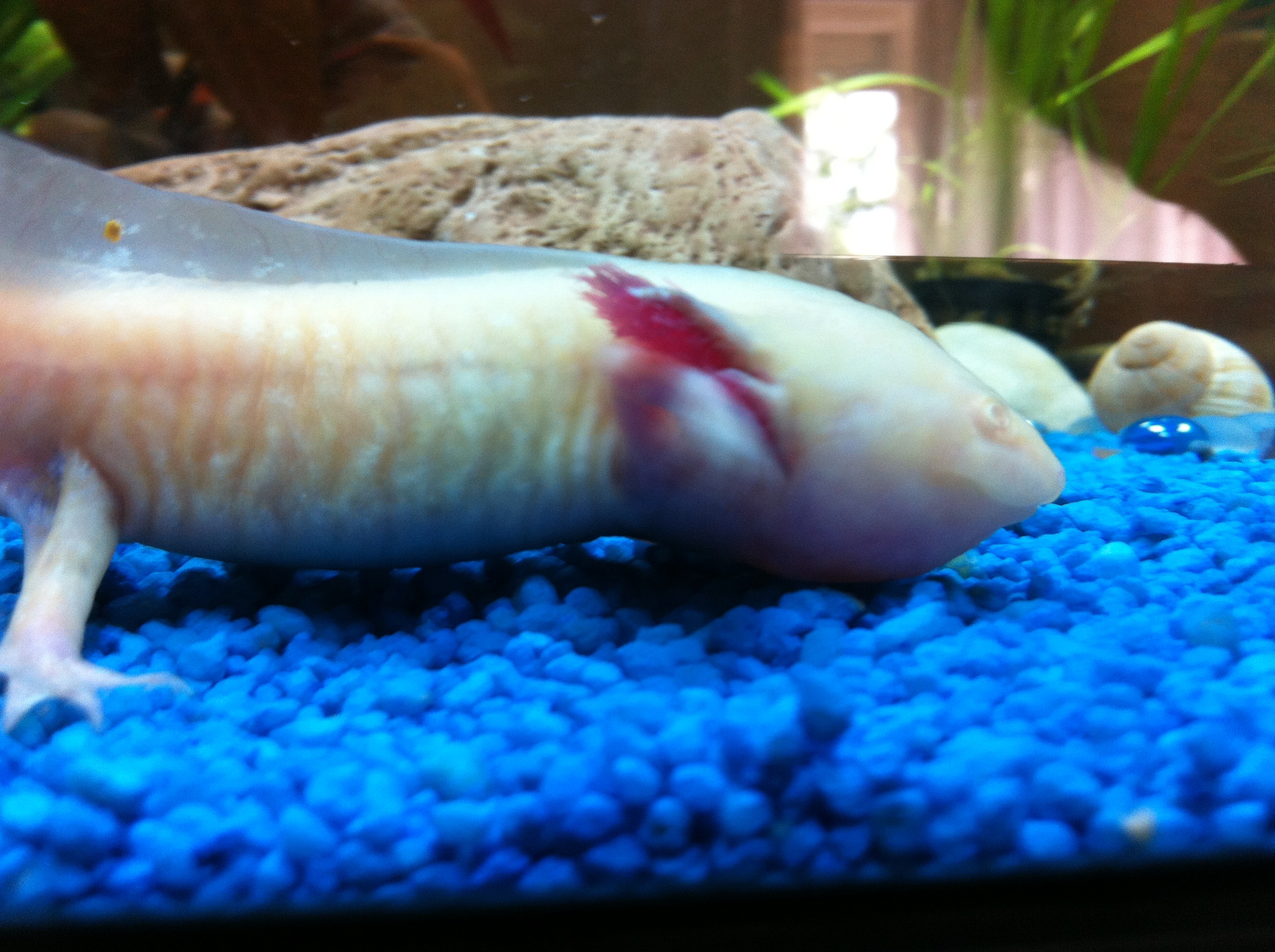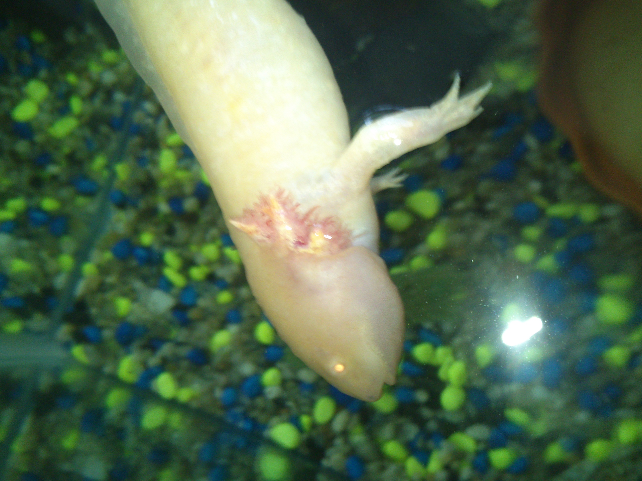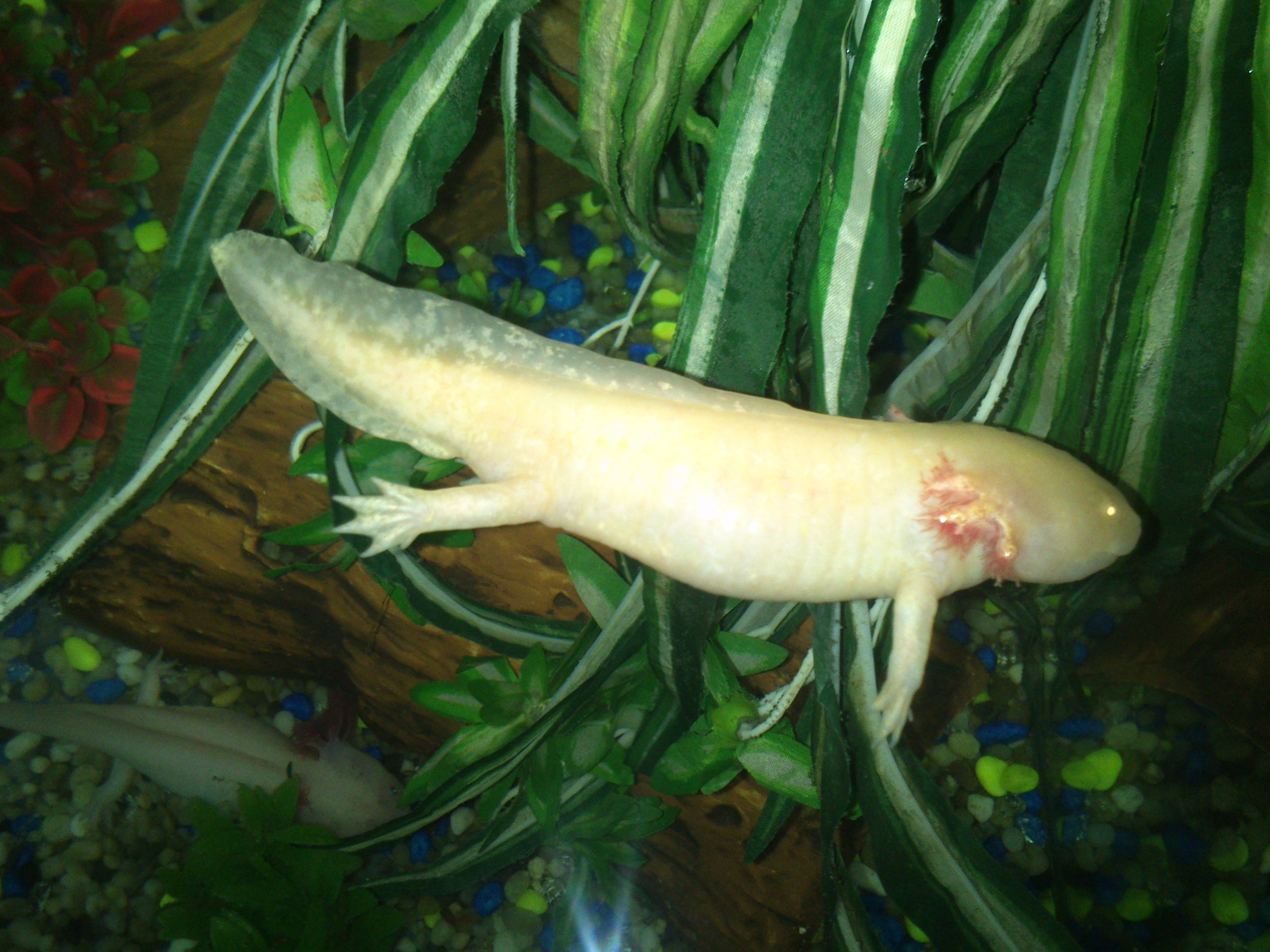 Sürgős segítségre lenne szükségünk az egyik pici, 6 cm-es axinkkal kapcsolatban. Pár hete lettünk lelkes gazdijai két axinak, az egyik fehér, a másik vadas színű. Az utóbbi axink, Patiszon pár napja levertnek tűnik, az etetéseknél volt ugyan étvágya, de jóval kevesebbet evett, mint a másik. Ma reggel pedig észrevettünk egy nagyon csúnya sérülést: az álla alatt hatalmas nyílt seb tátong, gyakorlatilag át van lyukadva a torka. Emellett, az egyik mellső lába nem mozog, de ebben az esetben inkább sérülésre gyanakszunk, mivel előfordulhatott, hogy a fehér színű párja, kihasználta a levertségét és odaharapott. Az állán azonban nem sérülésnyom látszik, hanem tiszta szélű, nyílt seb (lyuk). A fehér (Zeller) teljesen egészséges, jó étvágyú, mozgékony.