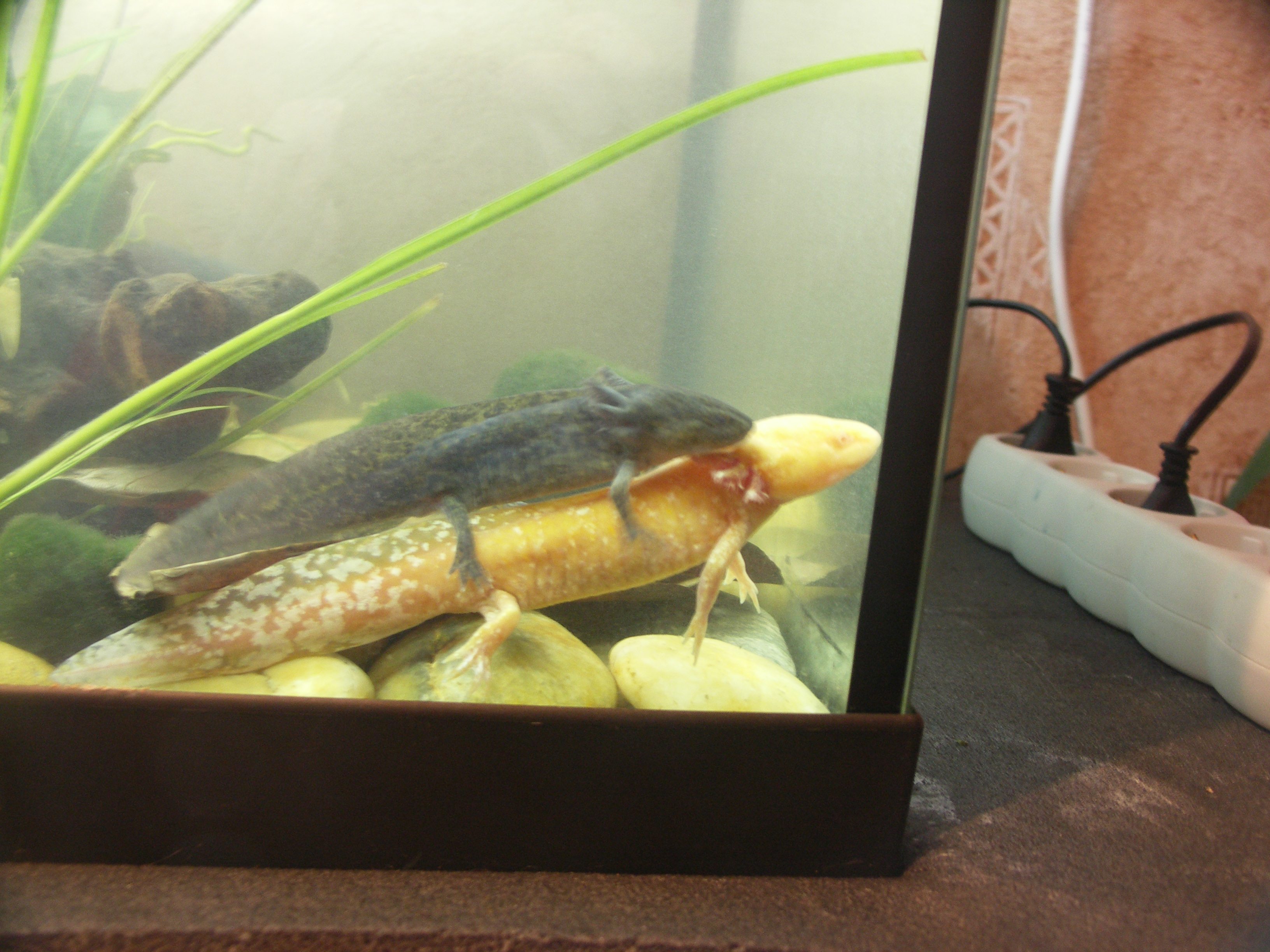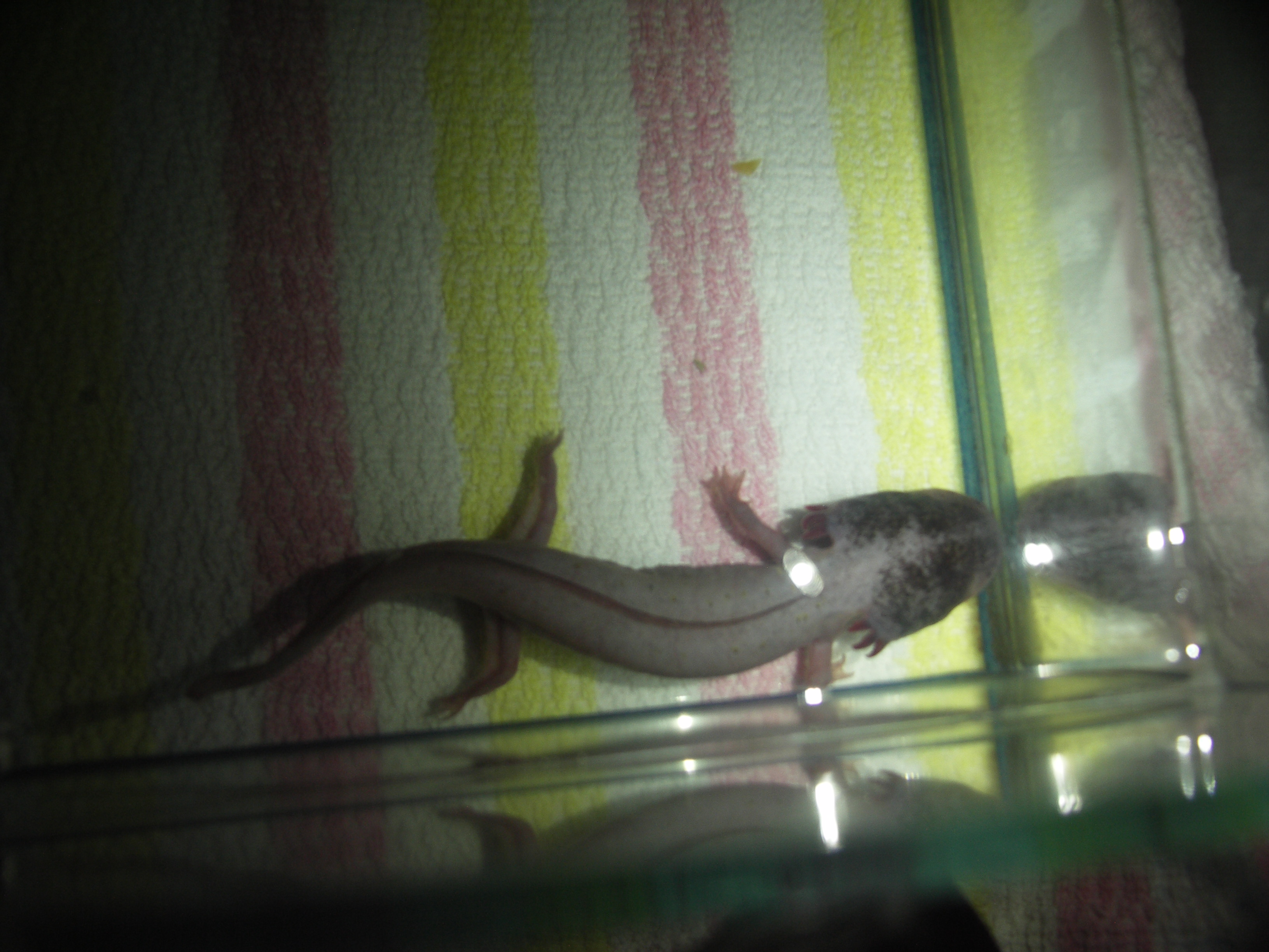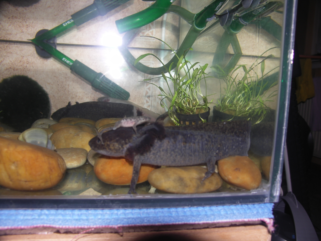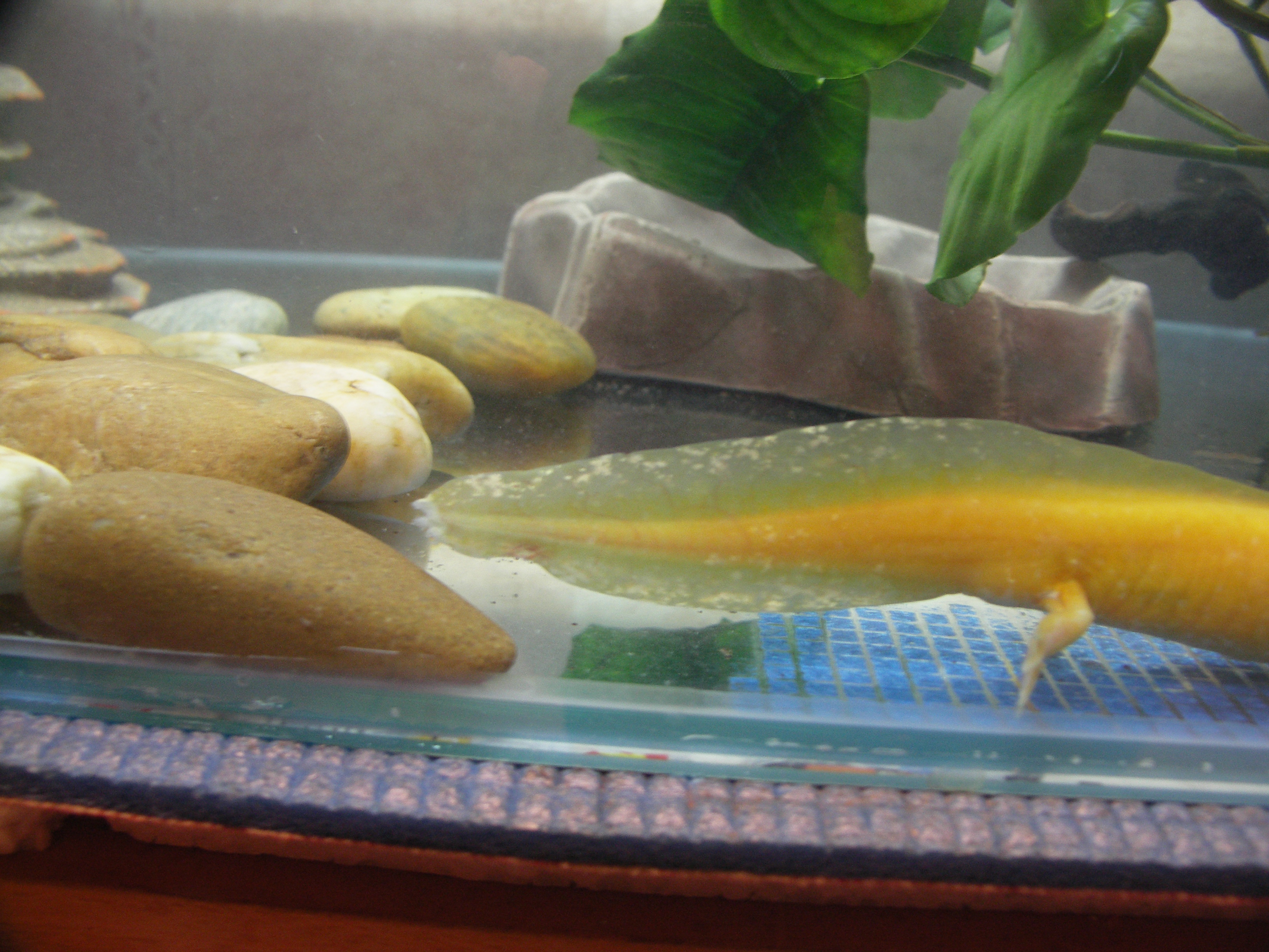 Maya írta:A kis szemtelen lányom nagyon szépen gyógyulgat. Nagyon jó gyerek, minden nap hajlandó enni, kissé kritikusan áll a csipeszhez nagyon furán tud belőle enni, de ha leteszem neki valahova megtalálja és mint egy porszívó felszippangatja. Az első héten még nem, de az elmúlt két hétben mindent megevett akármit adtam neki, élő-fagyasztott, evett tücsköt is, meglepődtem mert a májat nem igazán szereti, pedig nálam azért a többi megvan halva. A kopoltyúszőrei kezdenek visszajönni a kopoltyúja vastagabb lett, élénkebb színű, kicsit hosszabb is, de láthatóan javul. Sőt nem tudom miért de néhány dudor az oldalán kisebb lett, lehet hogy később a lábairól is eltűnnek majd a dudorok. Megszokhattátok a végére pár kép :).