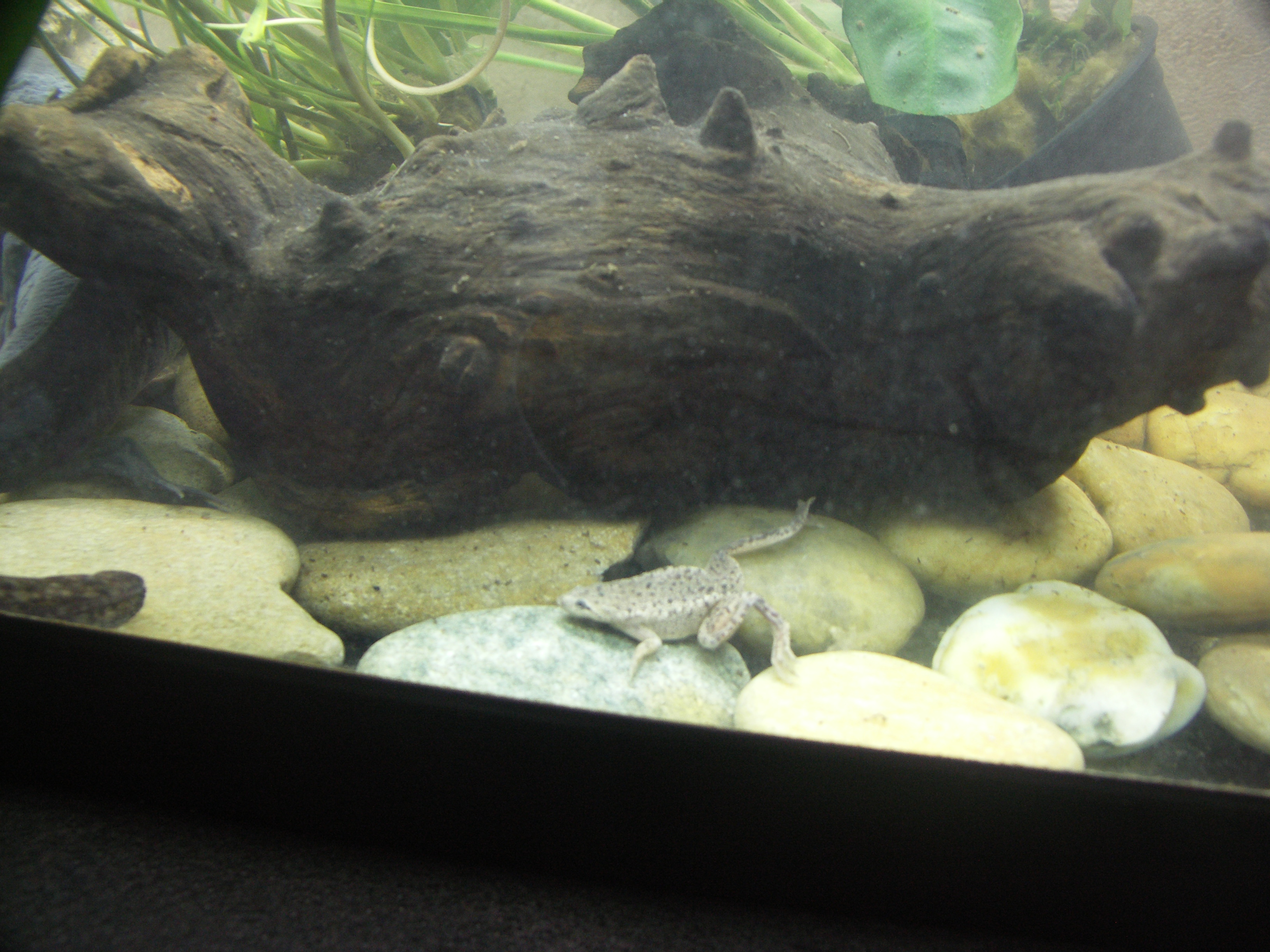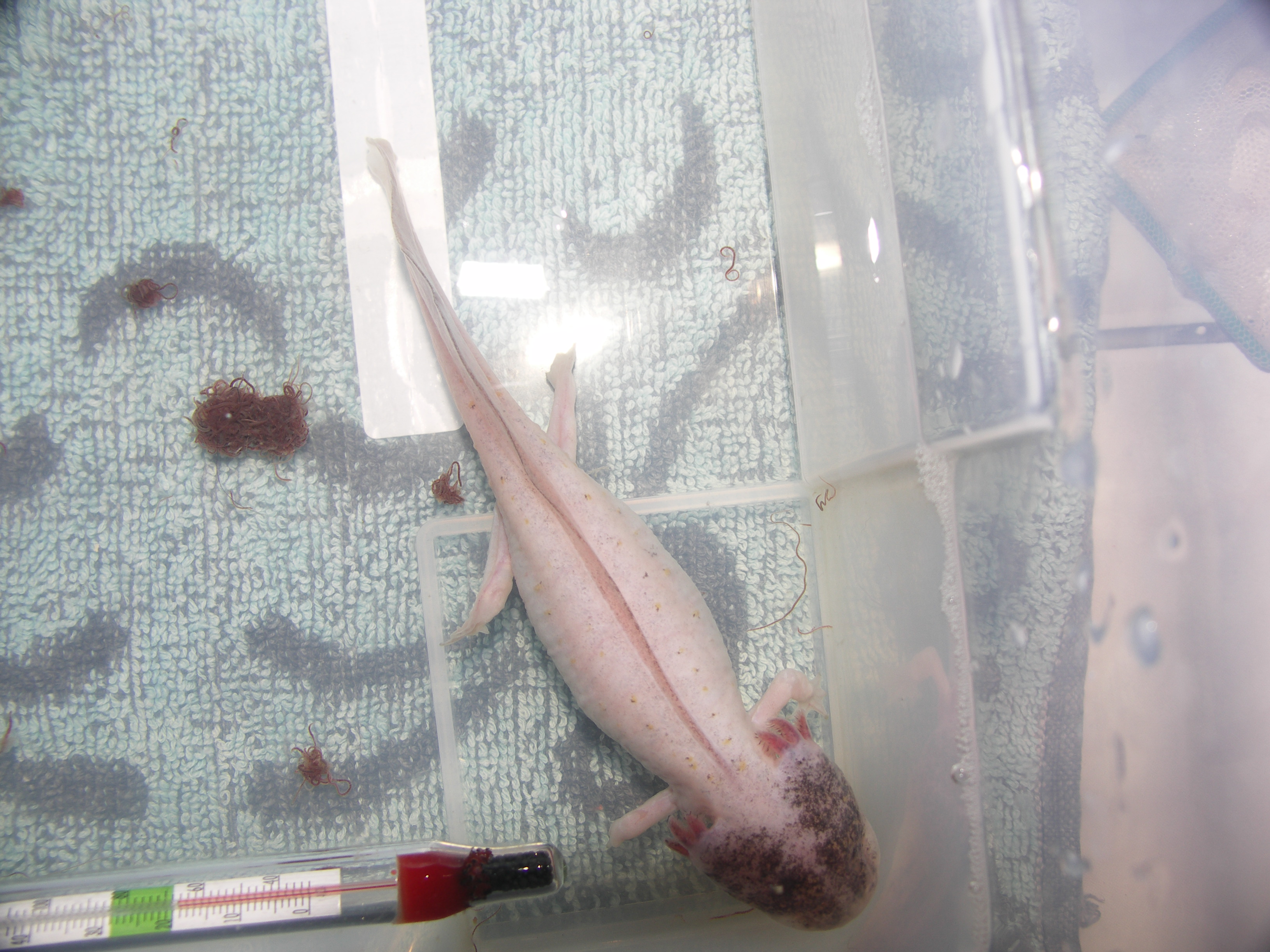 A kis szemtelen lányom nagyon szépen gyógyulgat. Nagyon jó gyerek, minden nap hajlandó enni, kissé kritikusan áll a csipeszhez nagyon furán tud belőle enni, de ha leteszem neki valahova megtalálja és mint egy porszívó felszippangatja. Az első héten még nem, de az elmúlt két hétben mindent megevett akármit adtam neki, élő-fagyasztott, evett tücsköt is, meglepődtem mert a májat nem igazán szereti, pedig nálam azért a többi megvan halva. A kopoltyúszőrei kezdenek visszajönni a kopoltyúja vastagabb lett, élénkebb színű, kicsit hosszabb is, de láthatóan javul. Sőt nem tudom miért de néhány dudor az oldalán kisebb lett, lehet hogy később a lábairól is eltűnnek majd a dudorok. Megszokhattátok a végére pár kép :).