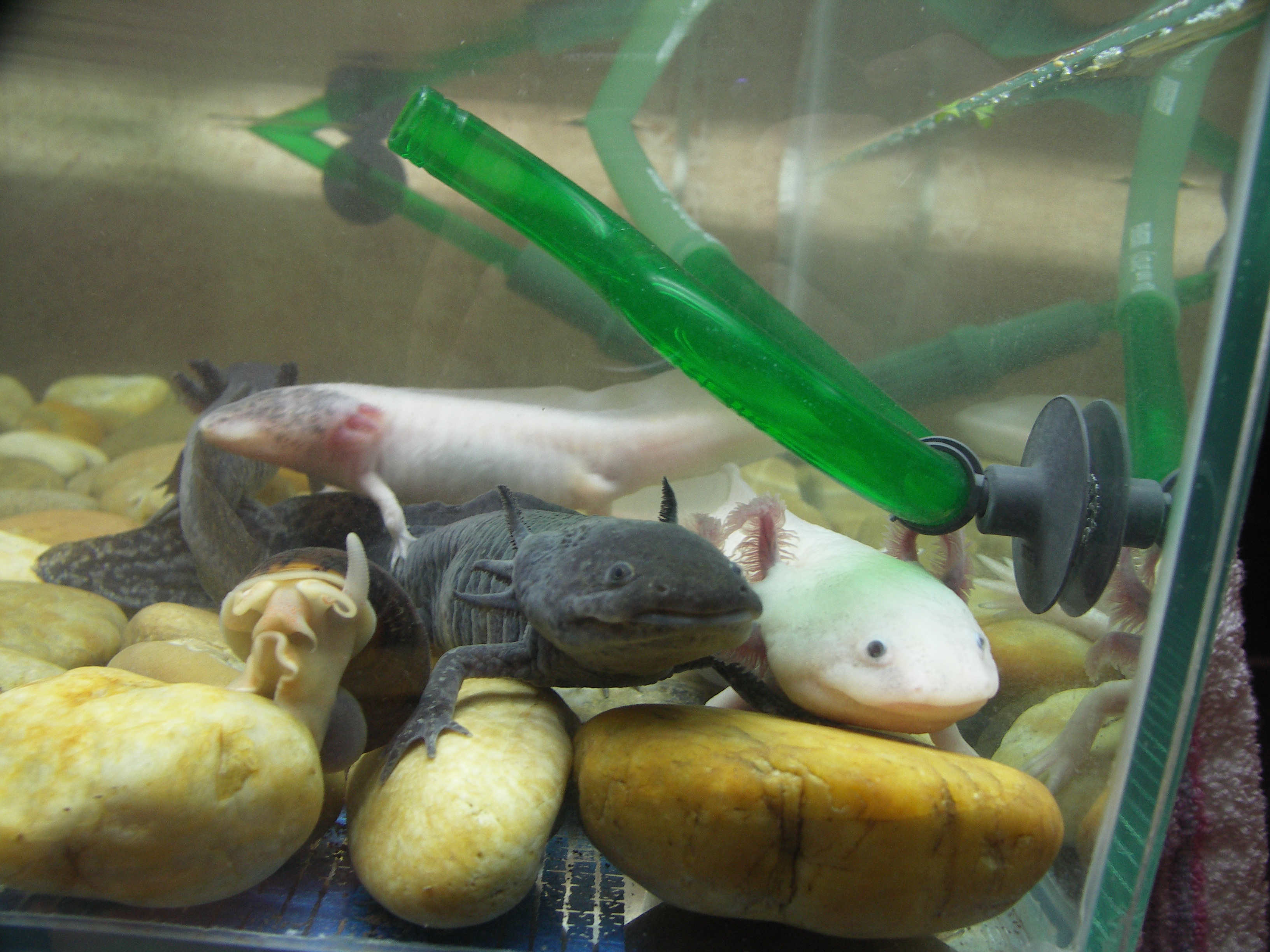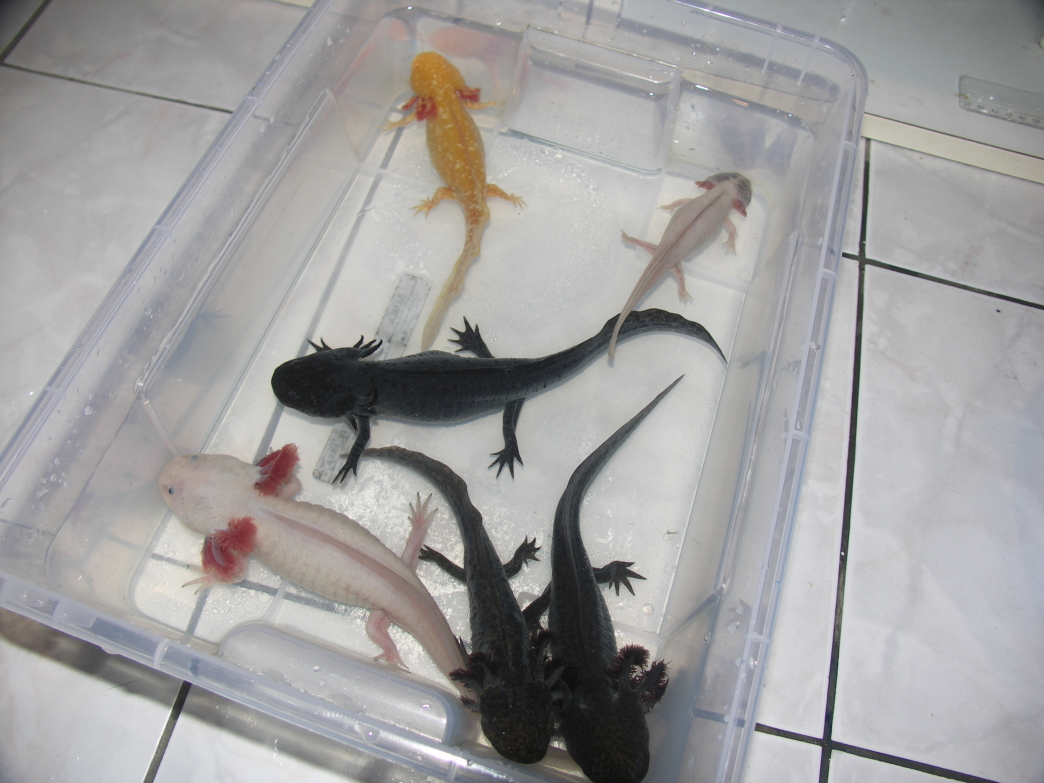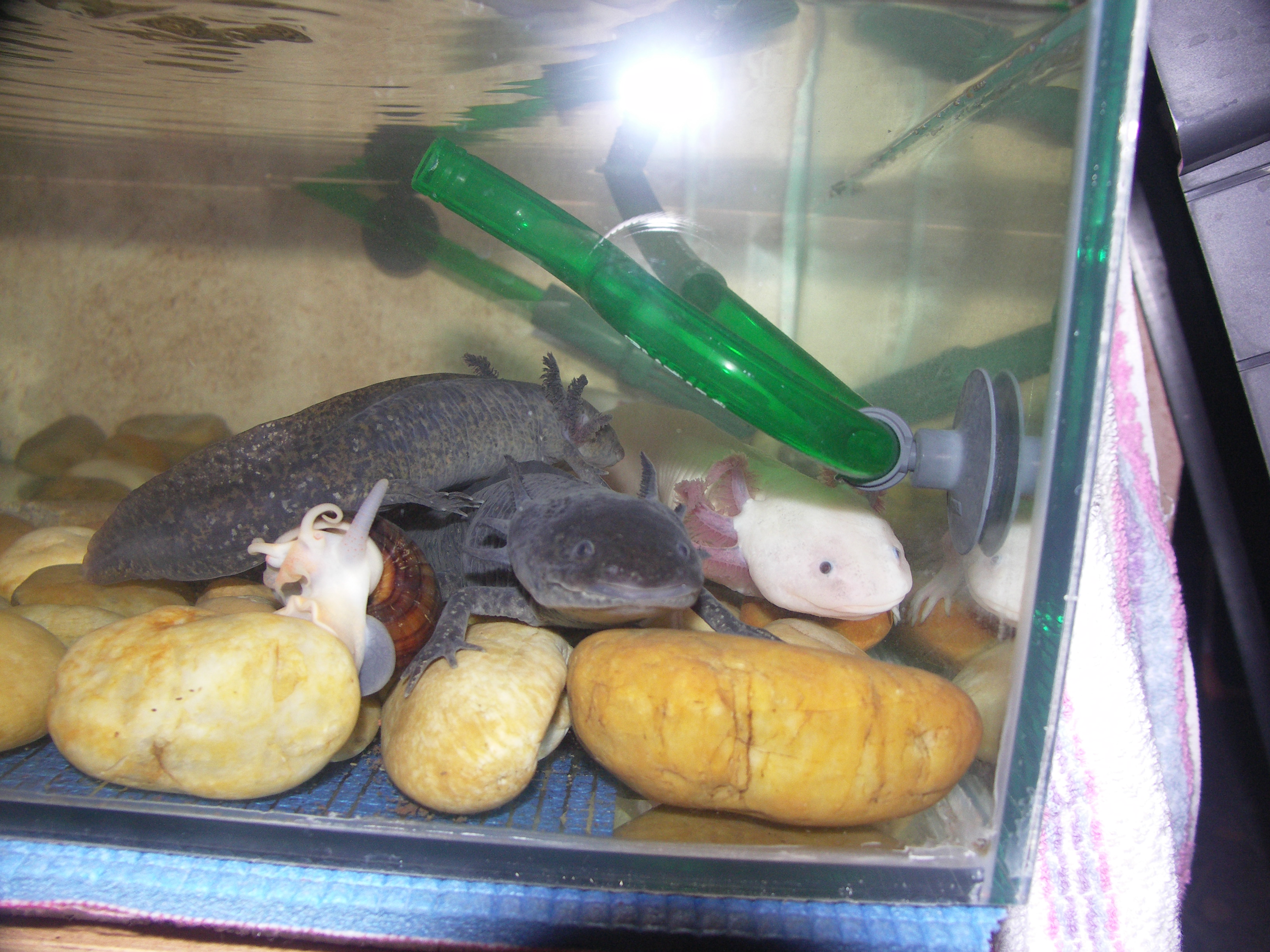Jelen: Rettentő rosszak és aktívak a kicsik, nagyon. A nagyok pedig tűrnek. Enni újra normálisan esznek, a crystal tablettás eset után nem akartak enni, mostanában semmi probléma nincs velük. Lekopogom. Mindegyikük jól van. Van 2béka haverjuk, hirugohan, japánul ebéd, és bangohan, vacsora, a nevük, legalább 4hónapja velük élnek és imádják egymást. Állandóan az axik körül vannak, a fejükön a hátukon, vagy az álluk alatt pihengetnek, csipeszből esznek, teljesen axinak képzelik magukat, és szerintem az axik is így látják őket. Ugyanúgy néznek ki, ugyanaz a hártyás úszóláb, a szín, rettentő aranyosak együtt, legközelebb veszek még békát, hogy mindegyiknek legyen egy. :D