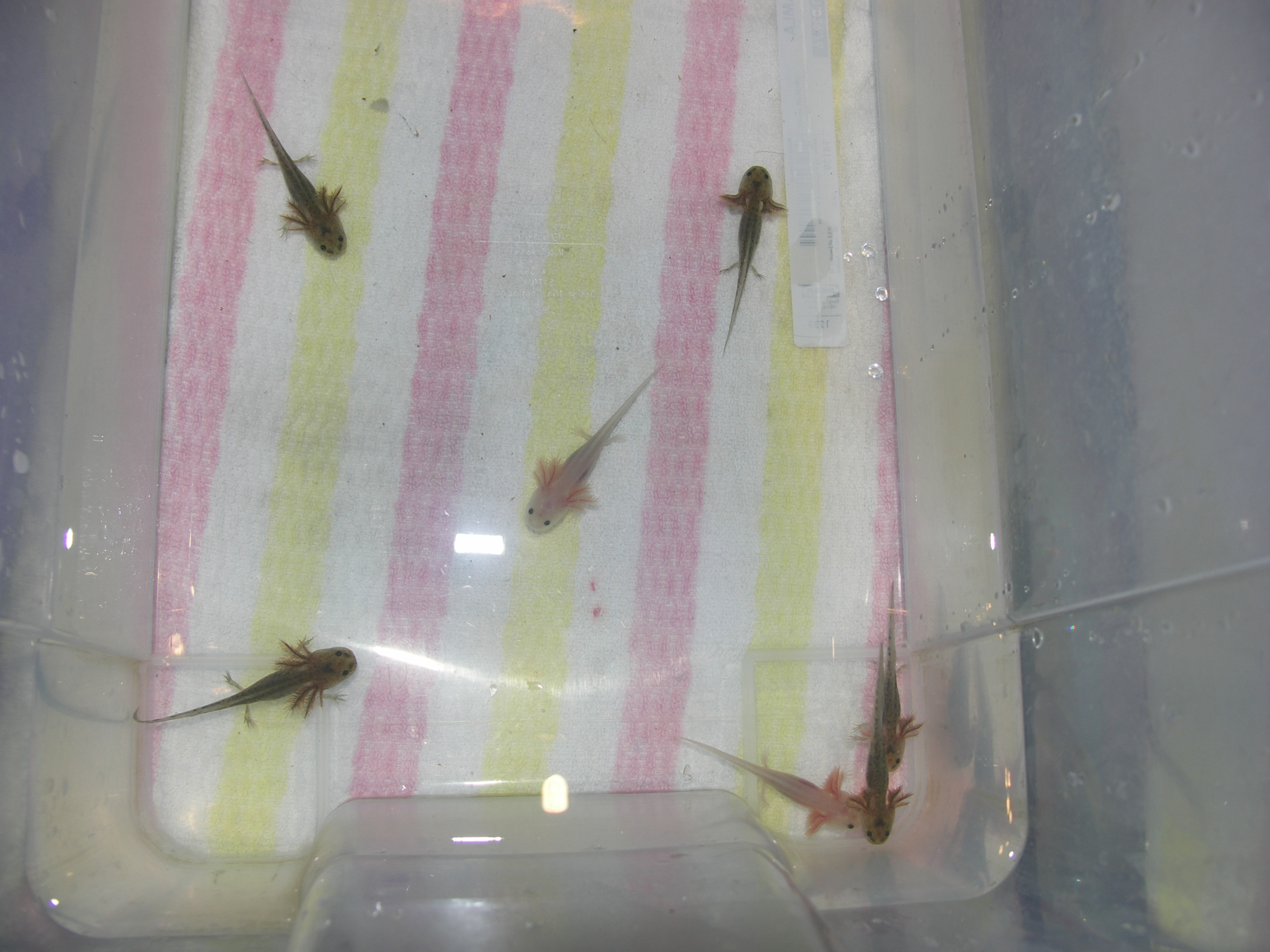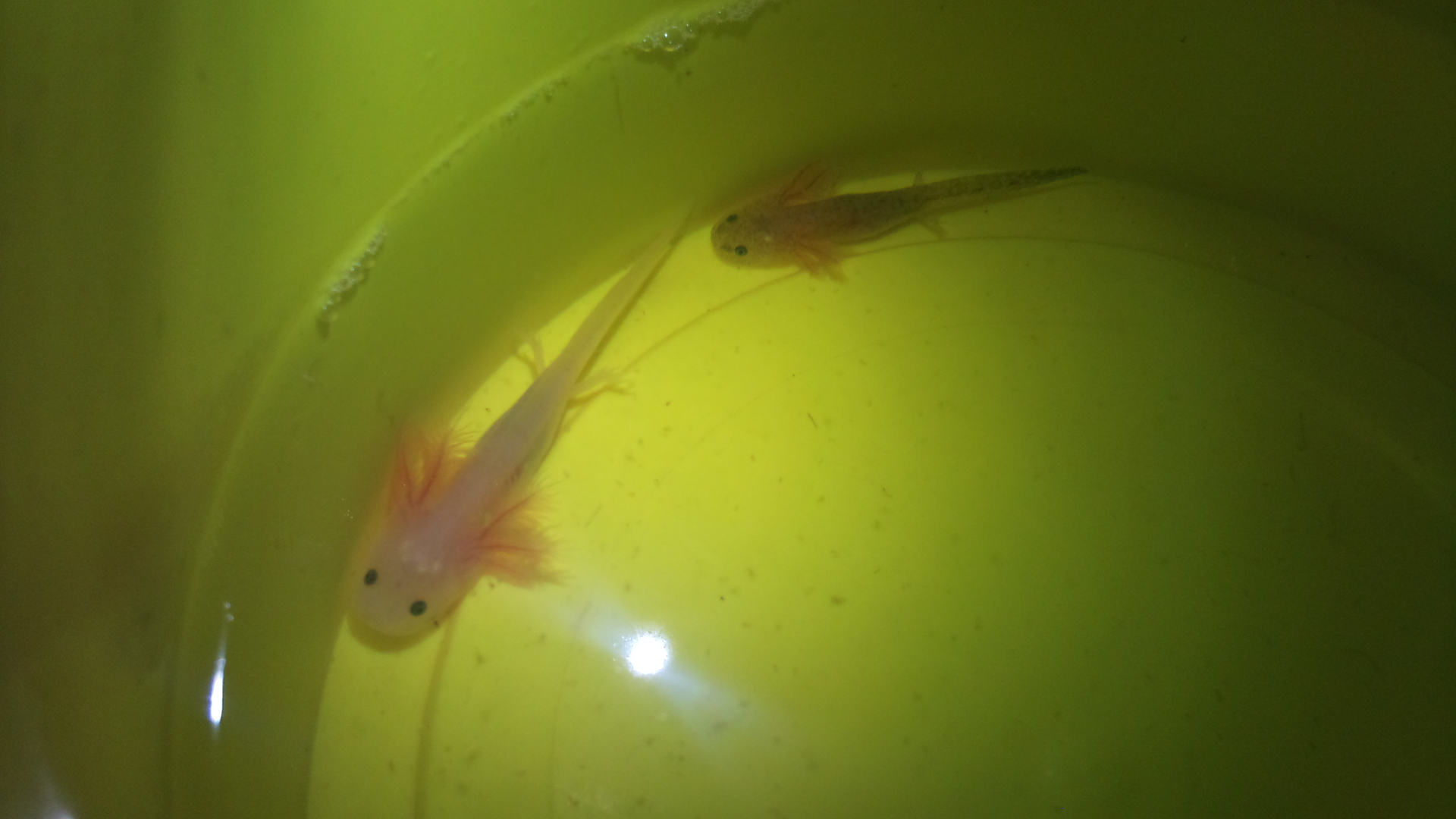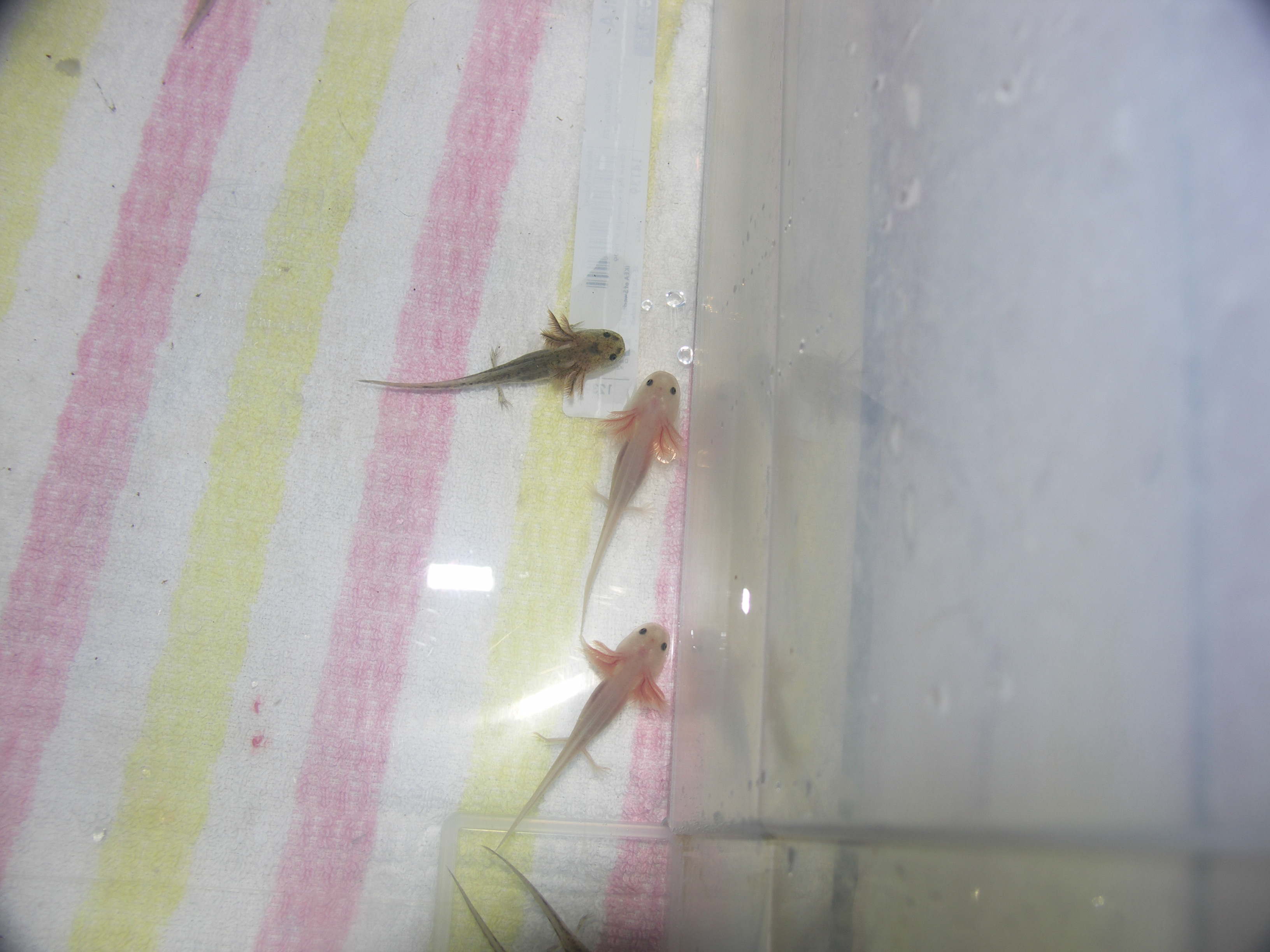 Most egy hónaposak a kicsik, mármint az első adag és rettentő kicsik még mindig. Nem tudom, hogy mekkora-hogyis néz ki egy egy hónapos axolotl, kicsit úgy érzem, hogy le vannak maradva szegénykéim. :( A legtöbbjüknek van már apró első lábacskája.