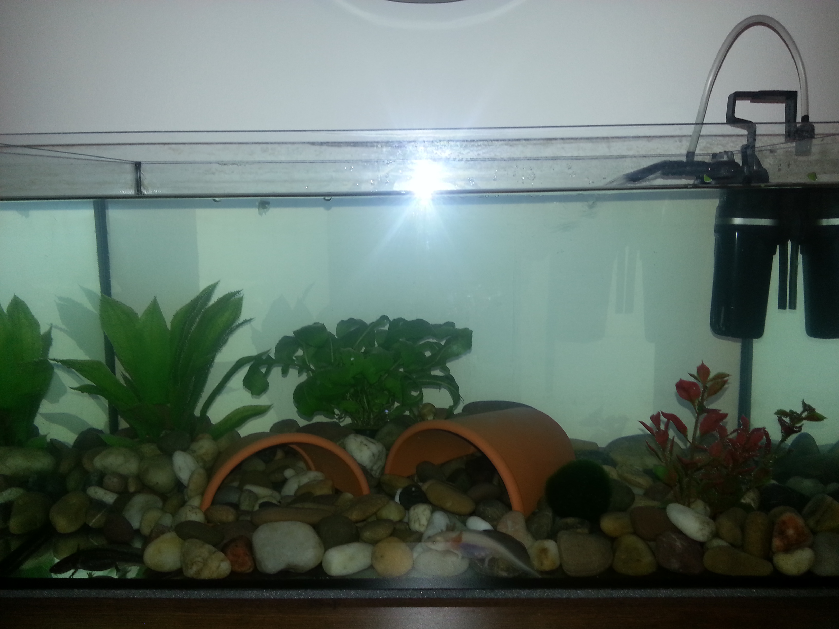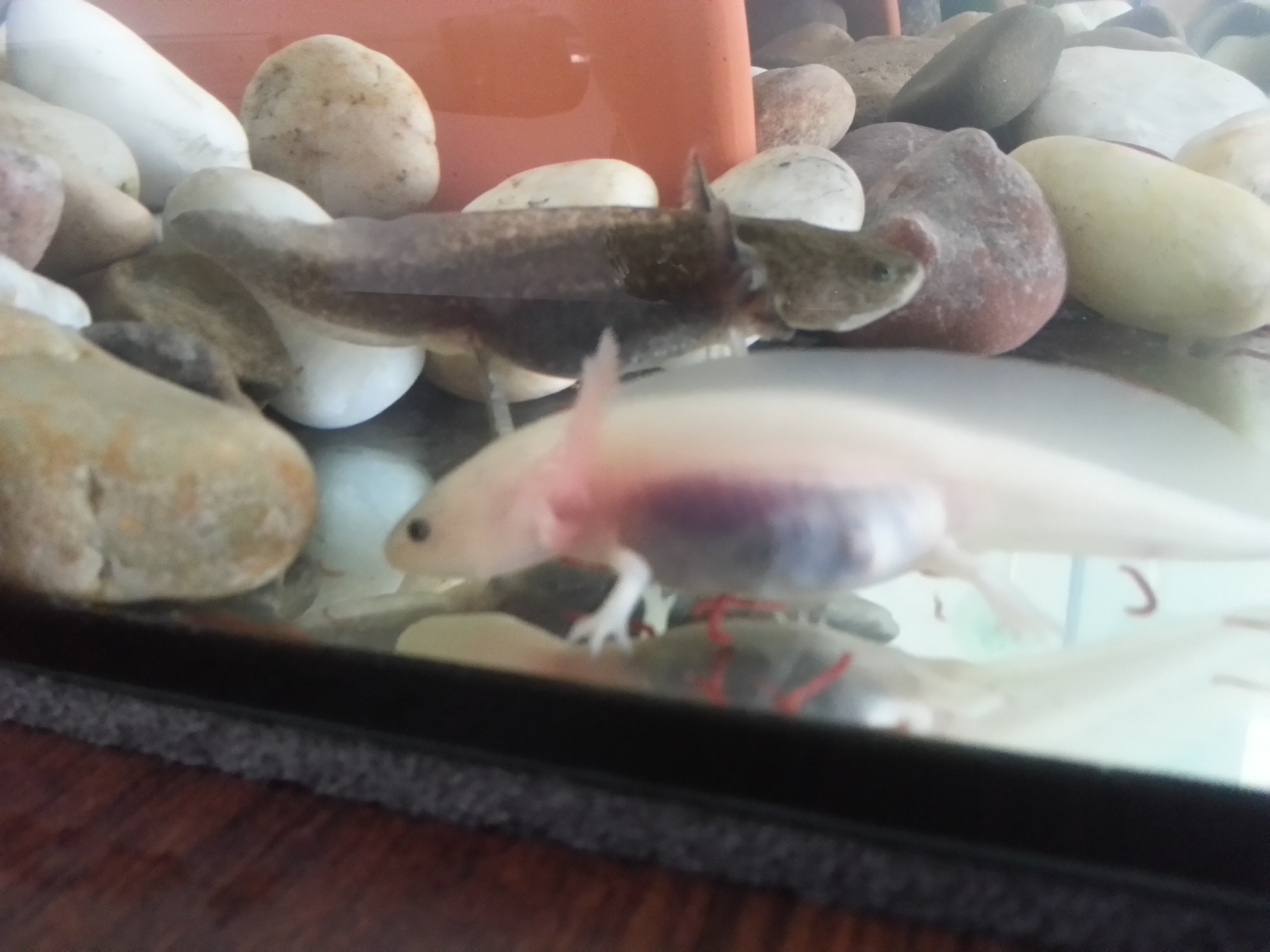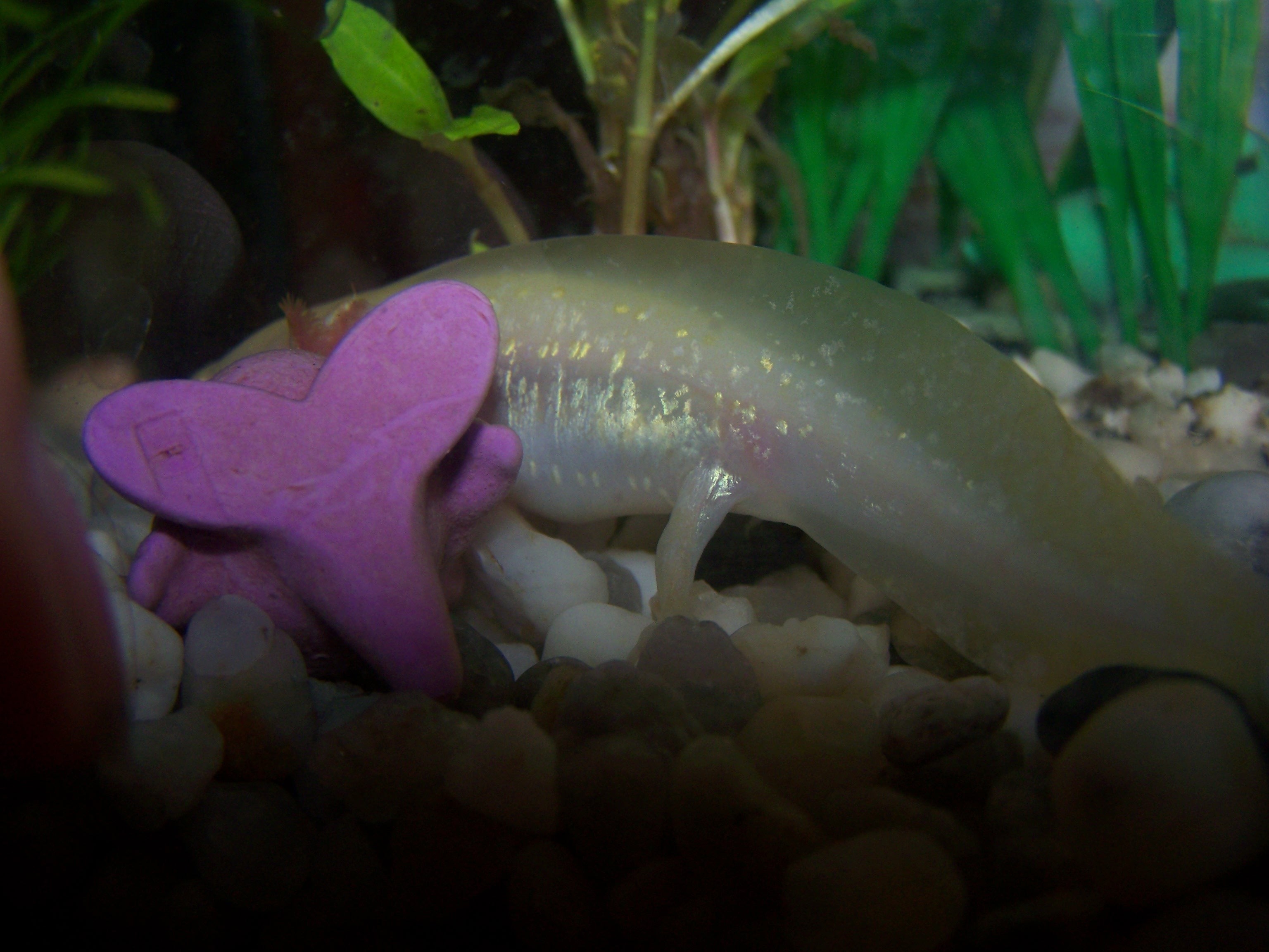 Ma már nem olyan lilás a pocija, valószínűleg jólakott :) Az apró dolog még ott van a pocijában, de mára kevesebbet látok. az akvárium alján megtaláltam 4db apró kavicsot, amit még az akvarisztikában ehetett meg. Az axik 7-8cm-sek. Hogy mikor születtek, az sajnos nem tudták megmondani. Tegnap délután láttam őket felmenni a víz felszínére, azóta nem. Lent mászkálnak, de nem lebegnek. Készítettem képeket is.