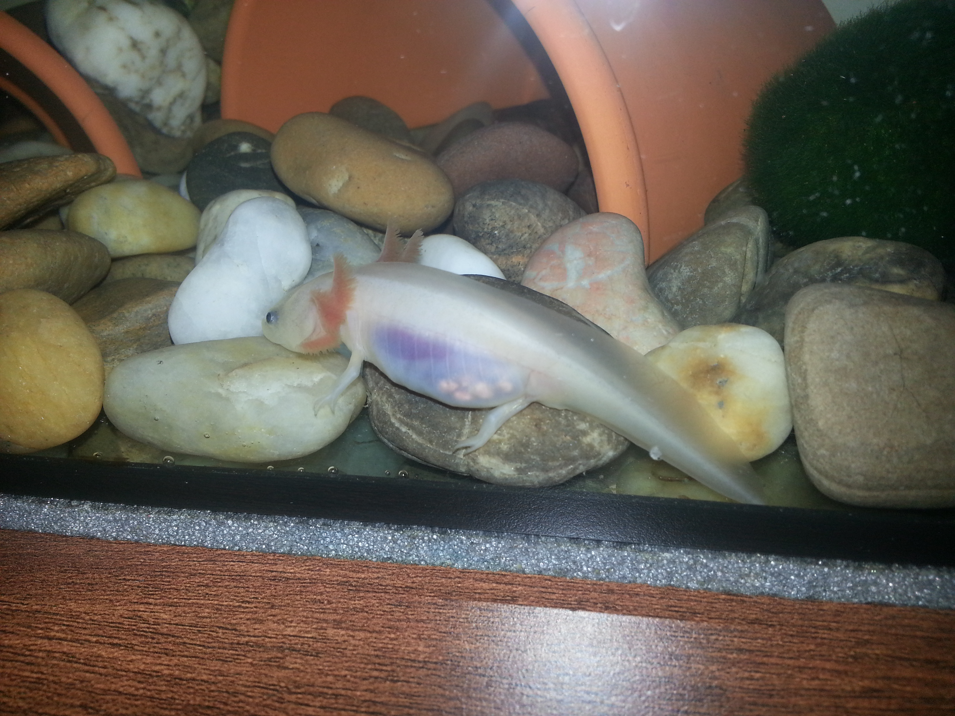 Nagyobbik axim valószínűleg lenyelt egy követ, mert látok a hasán, egy dudort és nemigazán megy fel levegőért... Azt viszont nem tudom, hogy tudta megenni a nagy követ, hisz még kicsi maga az axi is, nem tudom elképzelni, hogy tudta lenyelni